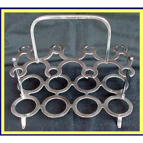 Signed Baccarat, stand / holder for 8 long-stemmed glasses. Made in France, exact date unknown, but probably early 20th century.<BR>Total height is 7 inches, including the handle. Distance accross is 8 1/4inches.<BR>Made of silver coloured metal. Stands on 4 simple legs, holding 8 metal circles on which the glasses can rest.<BR>8 c-shapes hold the stem of the glass, directly below the bowl. Distance between foot and bowl should be a little over 3 inches. Looks stunning when holding stemware. Handle for convenience of carrying.<BR>Underneath is Baccarat mark with bottle and 2 glasses under the name BACCARAT.<BR>Very good condition.
