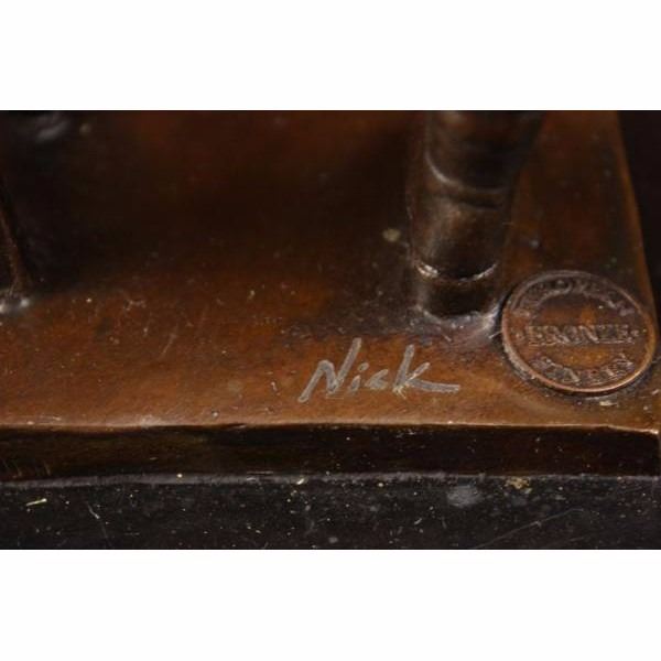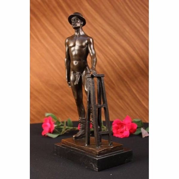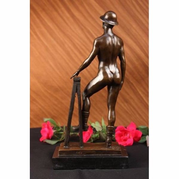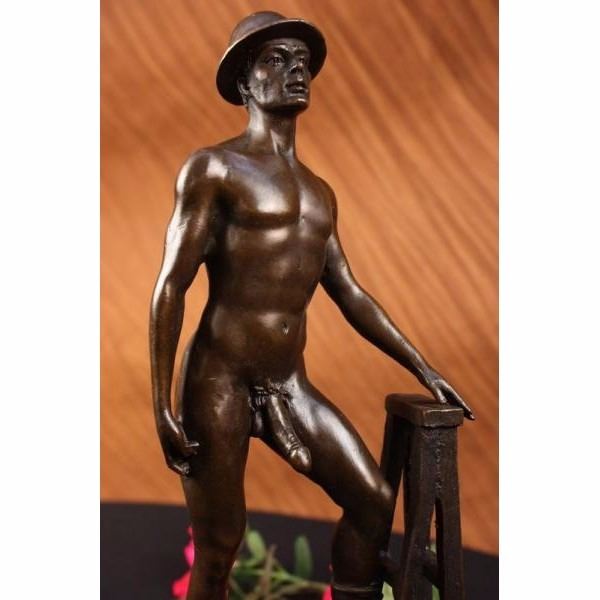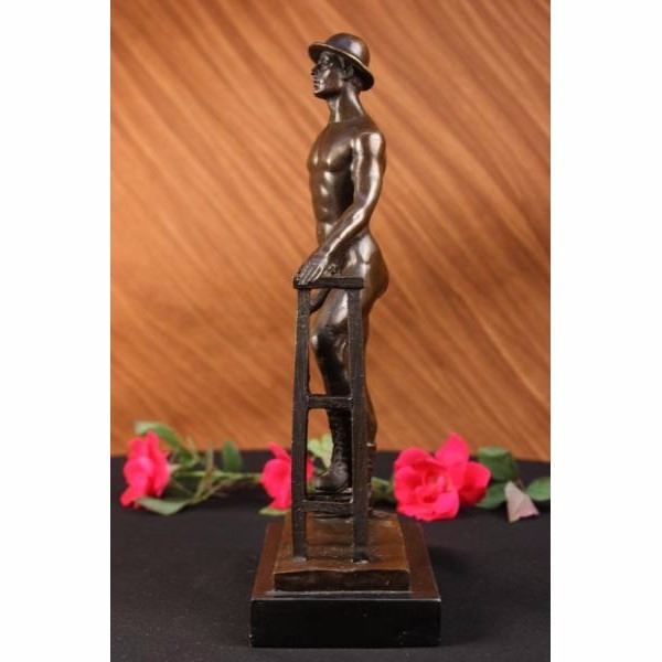 symbol of masculinity and confidence, this construction worker is not shy about his body as he works in the buff. He shows off all of his assets, wearing nothing but his workman boots. He comes to rest, with one leg up on his ladder, ready for a long days work. Cast using the "Lost Wax Method", this is an Original, 100% bronze sculpture is in a brown patina, carefully detailed and handmade. Signed by the artist Nick. Condition: This sculpture is in perfect condition. Bronze Dimensions with Marble Base:Height 10 1/2" x Width 5" Marble Dimensions: 5" X 3" . Height without base: 9 1/2" Weight : 5 LBS Inventory; 51ST0073815