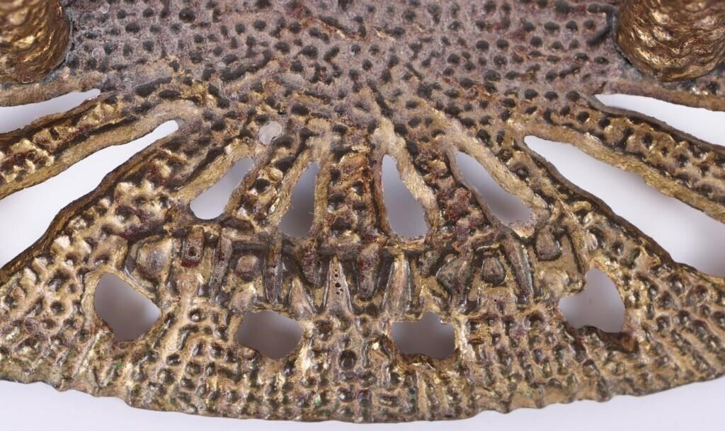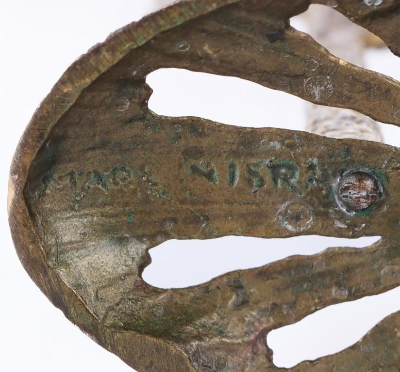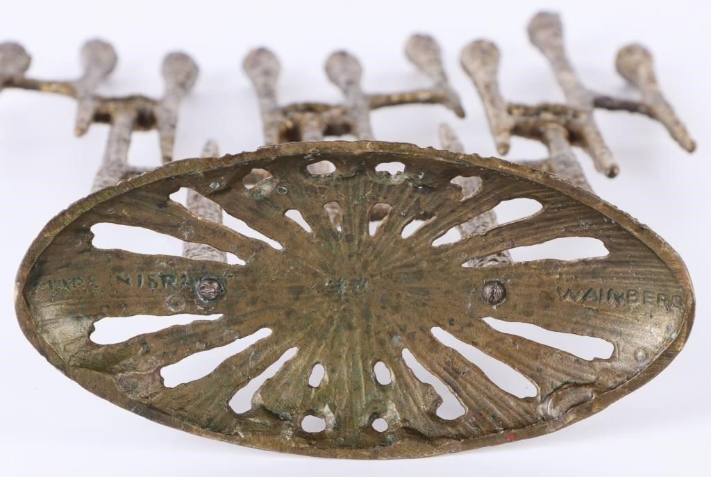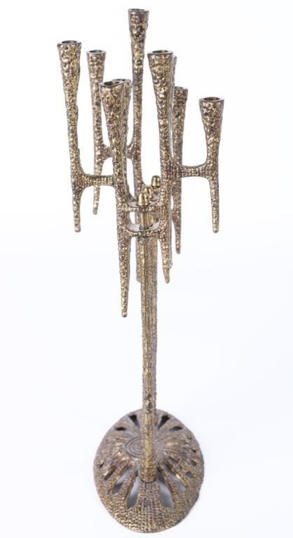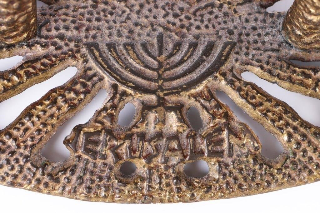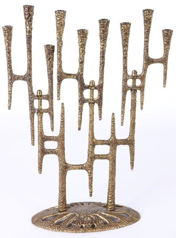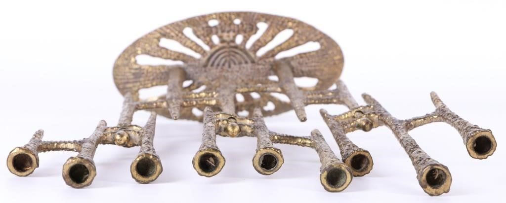 Brutalism-style Jewish temple menorah. The menorah is made of metal, and the sets of three candle spots swivel.