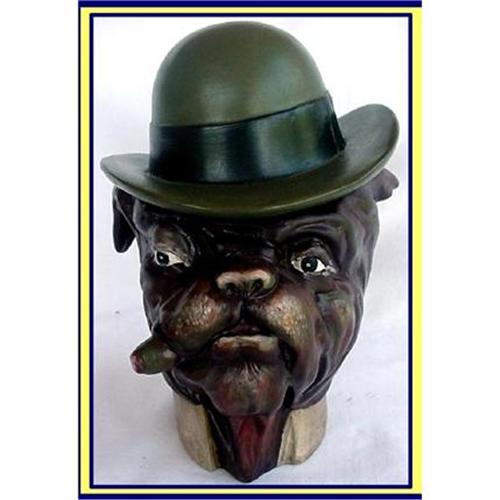 Ceramic tobacco jar / humidor modelled in the form of a bulldog in an army green hat, smoking a cigar. Signed. <BR>Measures 9 inches high.<BR> fantastically modelled head of a bulldog, handpainted <BR><BR>with fine detail down to the freckles around his nose and the shades of red and green that form the overall coating colour. Bulldog with a high stiff collar and a bowler <BR><BR>hat in army green. A stub of a cigar juts out of his mouth. <BR>Signed underneath Xonex and on the side Klnnt (both hand incised marks.)<BR>Good condition. No chips/cracks/damage of any sort.