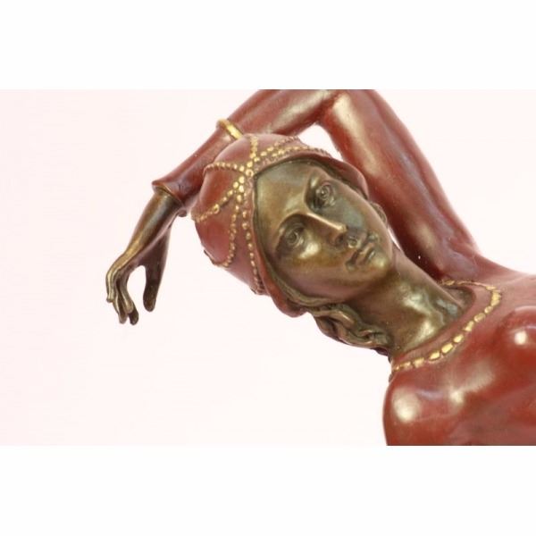 This beautiful bronze sculpture is known as "The Exotic Dancer", one of the many of Chiparus' famous artworks. Here you see a dancer from the Ballet Russe also known as the Russian Ballet. This agile dancer performs an unforgettable dance, one that Chiparus has decided to capture for life. Here she is shown kneeling on one knee while her other leg is straight out in front of her. She leans back using her one arm to support her as her other arm gracefully falls back around her head. By extending her arm and leg it elongates her body and opens her bodice to give the sculpture more dimensions. She wears a leotard which is skin tight against her upper body and her skirt has slights exposing her thighs. Her gold belt is thick and accentuates her waist as it rests against her red dress. She has gold beads that string across her neck and she wears gold bangles on her wrists. She wears a headpiece that matches her ensemble and is adorned with intricate gold beads. This bronze sculpture portrays the flexibility and agility of the ballet dancer beautifully. This sculpture was cast using the "Lost Wax Method" and has a red, gold and brown patina. This sculpture is handmade and 100% bronze, it is signed D.H. Chiparus. Demetre Haralamb Chiparus (also known as Dumitru Chiparus; 16 September 1886, Dorohoi, Romania - 22 January 1947, Paris, France) was a Romanian Art Deco era sculptor who lived and worked in Paris. He was born in Romania, the son of Haralamb and Saveta. In 1909 he went to Italy, where he attended the classes of Italian sculptor Raffaello Romanelli. In 1912 he traveled to Paris to attend the Ecole des Beaux Arts to pursue his art at the classes of Antonin Mercie and Jean Boucher. Demetre Chiparus died in 1947 and was buried in Bagneux cemetery, just south of Paris. Condition: This sculpture is in a very good condition. Bronze Dimensions with Marble Base:Height 10" x Width 16"Marble Dimensions: 13" X 5".Height without base: 9" Weight :15 LBSInventory 3451b175j43 This beautiful bronze sculpture is known as "The Exotic Dancer", one of the many of Chiparus' famous artworks. Here you see a dancer from the Ballet Russe also known as the Russian Ballet. This agile dancer performs an unforgettable dance, one that Chiparus has decided to capture for life. Here she is shown kneeling on on