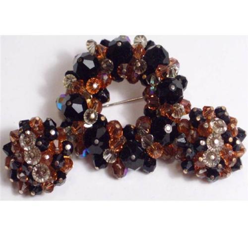 This is even prettier than the photos and is really thick ( 1") and well made. The brooch is loaded with hand wired faceted glass jet, golden aurora borealis and crystal stones and it measures 2" wide ( really heavy too) .The matching earrings are 1" wide and aware clip on They are marked Laguna. These are in very good condition and really sparkles!