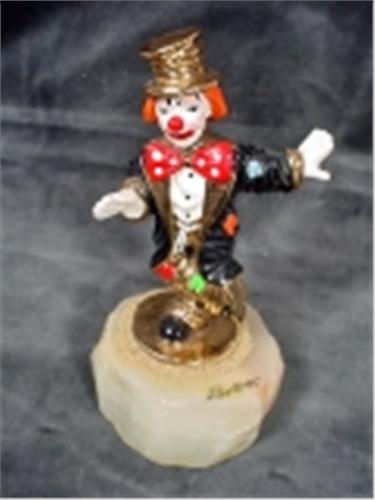SIGNED CLOWN FIGURINE ON ONYX BASE ACCENTED WITH 24KT GOLD BY RON LEE '95. 6". AS AN ARTIST AND SCULPTOR FOR OVER 25 YEARS, RON LEE HAS CREATED THE WORLD'S LARGEST AND FINEST COLLECTION OF LIMITED EDITION CLOWN FIGURINES. SCULPTURES FOR DISNEY©, WARNER BROS., UNIVERSAL STUDIOS, AND HIS WONDERFUL SELECTION OF CLOWN FIGURINES INCLUDING HOBO JOE AND EMMETT KELLY JR. ARE VALUED BY COLLECTORS AROUND THE WORLD! ALL SCULPTURES ARE HAND PAINTED, AND MOUNTED ON AN ONYX BASE. MOST ARE 24K GOLD PLATED.