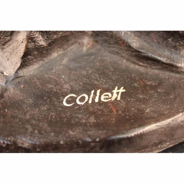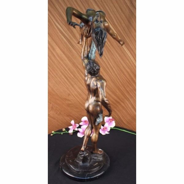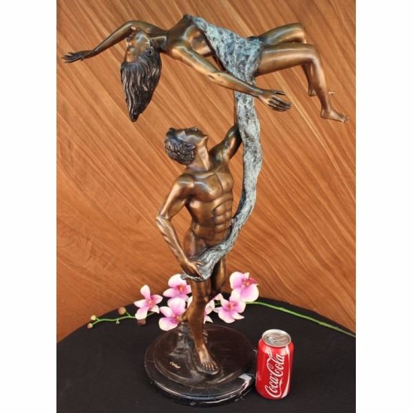 This lovely sculpture of a man ballerina carrying his partner up high above him. The strength on this man is magnificent, he carries her with just one hand. A piece a clothe above their nude bodies is just one of the things they chair in common. It lays on her upper and all her mid section,only exposing her legs and arms. While it falls down from her body it is nicely placed atop the mans right thigh covering his private area. The handmade bronze sculpture was cast using the ancient method of lost-wax casting and stained with a brown patina finish for preservation. It is mounted upon a black marble base and is signed Collett. Condition: This sculpture is in perfect condition. Bronze Dimensions with Marble Base:Height 27" X Width 20" Marble Dimensions: Diameter 9" Height without base: 26" Weight : 25 LBS Inventory:60-57752M11006