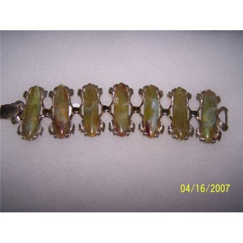 Up for sale is a signed ~Coro~ Cabochon Bracelet. It is set in goldtone. It has a fold over clasp. The front and back are in excellent condition. It would make a lovely spring/summer bracelet