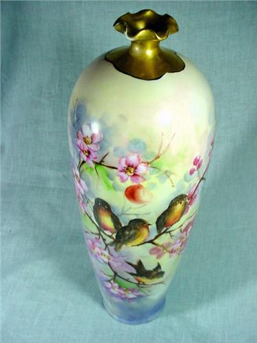 SIGNED CS GERMANY TALL HANDPAINTED BIRD AND FLORAL THEMED VASE WITH RUFFLED GOLD RIM. 17"