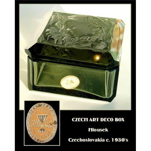 Great Czech Art Deco lidded powder box with 3 dimensional relief design of Mercury head . Steel gray colored crystal box is "signed" on label : HLOUSEK, Bohemia. Hlousek was one of the renowned glass refiners operating from Zelezny Brod, Czechoslovakia. They closed their operation shortly after the WWII. Acquired directly from the Hlousek Estate in mint condition, dimension : 3.5 x 3.5 inches wide, Czechoslovakia circa 1930's.