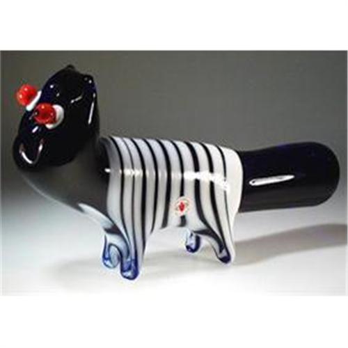 This highly decorative cat figure was handmade in 1998 in a BERANEK glass-workshop of Central Bohemia, Czech Republic. This Art glass piece is quite heavy - 11 inches long and 6 inches high. White stripes fused in cobalt blue glass body with applied white/red/black eyes. Signed : Beranek, mint condition. For Ebay Live Auctions photos are automatically reduced, so if you want to see larger, more detailed pictures, please email us