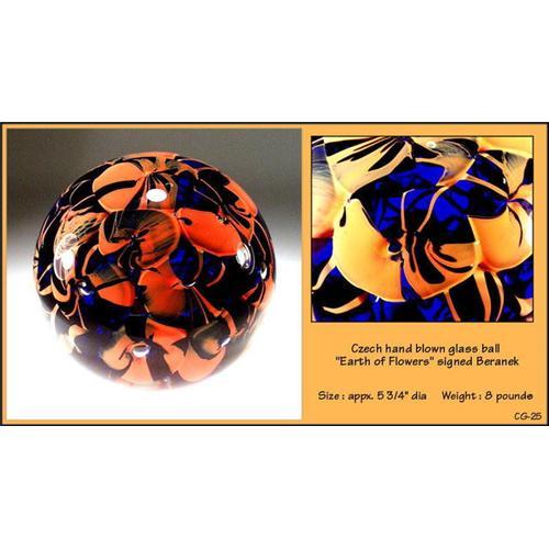 This breathtaking floral paperweight SPHERE handmade in 1999 in a BERANEK glass-workshop of Central Bohemia, Czech Republic. This Art glass piece is very heavy (8 pounds) and 5 3/4" in diameter. It is so hard to capture the beauty of 3D design, which eye so easily perceives. 3 dimensional dark orange and cobalt blue flowers about 5/8" tick are embedded between clear glass inner core and clear glass outer wall. Signed : Beranek, mint condition. Please see the vase in identical design listed separately. Please note that in some cases photo sizes are automatically reduced, so if you want to see full size or detailed pictures, please email us