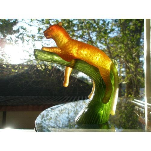 We present to you a DAUM COLLECTION from the Masters at DAUM in FRANCE - PANTHER AND GREEN TREE-PANTHERE ET ARBRE VERT made useing PATE DE VERRE Techniques a rare and ancient form of art simular to the lost wax style used for bronze sculptures.(pate de verre captures both fine details and subtle contouring)Signed by DAUM on bottom 6" tall we paid 750.00 for this sculpture a little over a year ago the retail now is 1050.00 DAUM IS HIGHLY COLLECTABLE AND WILL CONTINUE TO ESCALATE IN PRICE!!