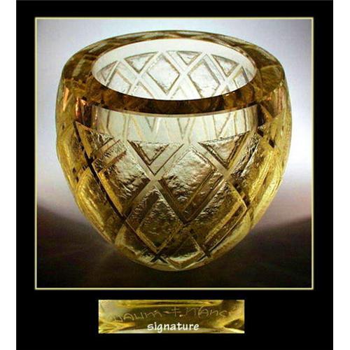 This item is referenced in Le Genie Verrier de l'Europe by Giuseppe Cappa. Daum specialized in acid etched Art Glass. This is a fine example of their work on blown yellow citrine glass diamond shaped losanges are placed in a rotating spiral manner on the surface. Within each diamond 1/3 is smooth and 2/3 is rough produced via repeated acid baths. The smooth and rough sections are in the same location for each sprialing column and inverted in the adjacent column. The separating spiral column lines are clear. The vase is in excellent condition, 5-1/4" high, 6" in diameter, walls are 3/4 inches thick. Signed Daum, Nancy etched along the base. Investment grade antique collectible. Please note that in some cases photo sizes are automatically reduced, so if you want to see full size or detailed pictures, please email us (). Please note that only bids at or over $2200 will be succesfull and meet our reserve....
