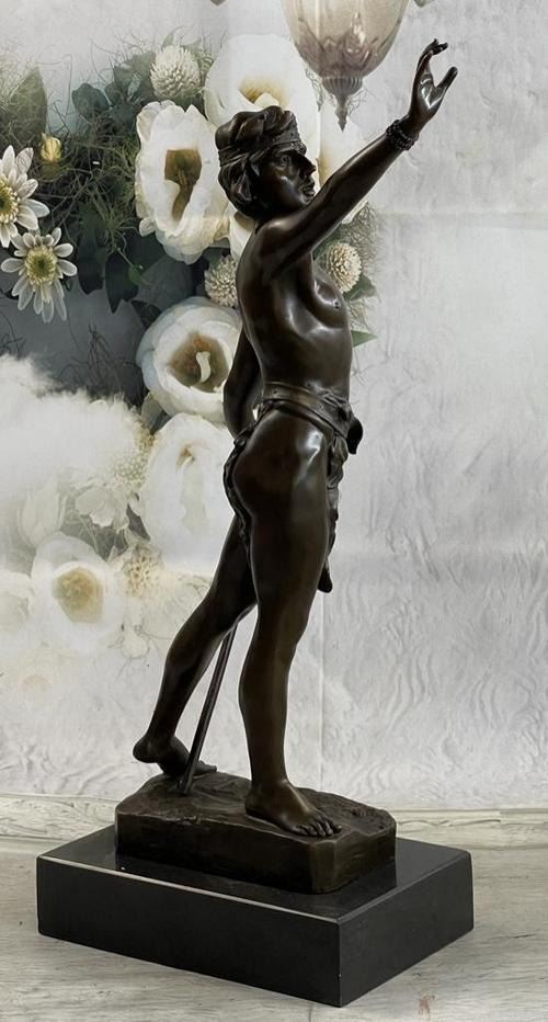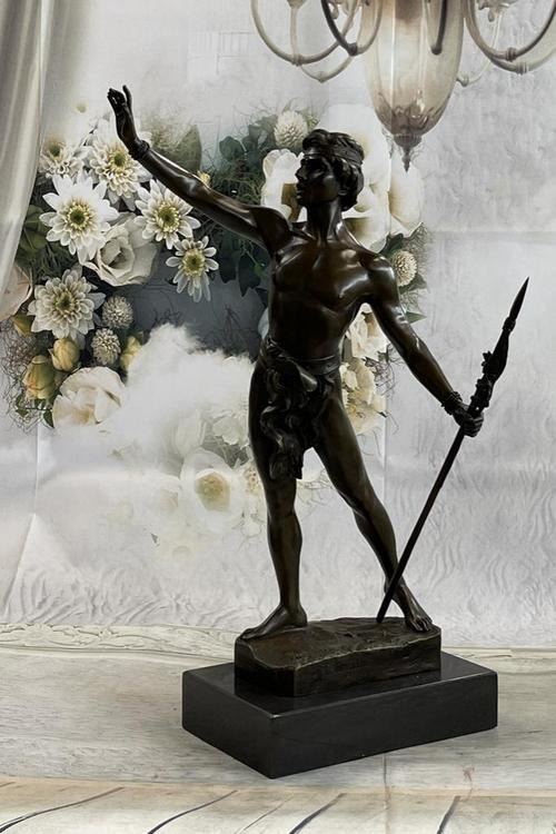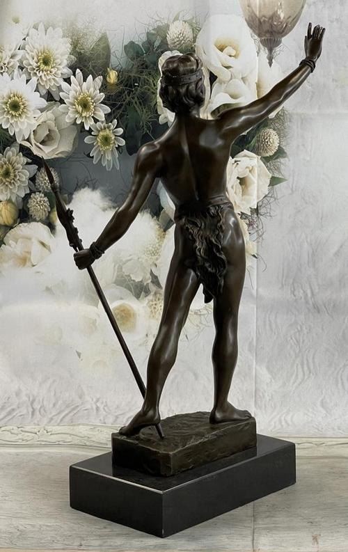 hand to silence their battle cries. He will give the order to attack. They will wait for the moment when he signals them to charge forward, risking it all for their land, women and children. He clutches a spear in his hand and wears nothing but a loin cloth around his waist. No heavy clothes to weigh him down. No clunky weapons to maneuver. He is lean and muscular. His strong legs have great speed and he is agile on his toes. He will need the skills he has obtained over the years to win this fight and live to see another. This handmade sculpture was carefully detailed. Notice his brow arching with determination and his lips parting to deliver the order. 100% bronze, this brown patina sculpture was cast using the Lost Wax Method and mounted on a black marble base. Signed by the artist L. Domenech.