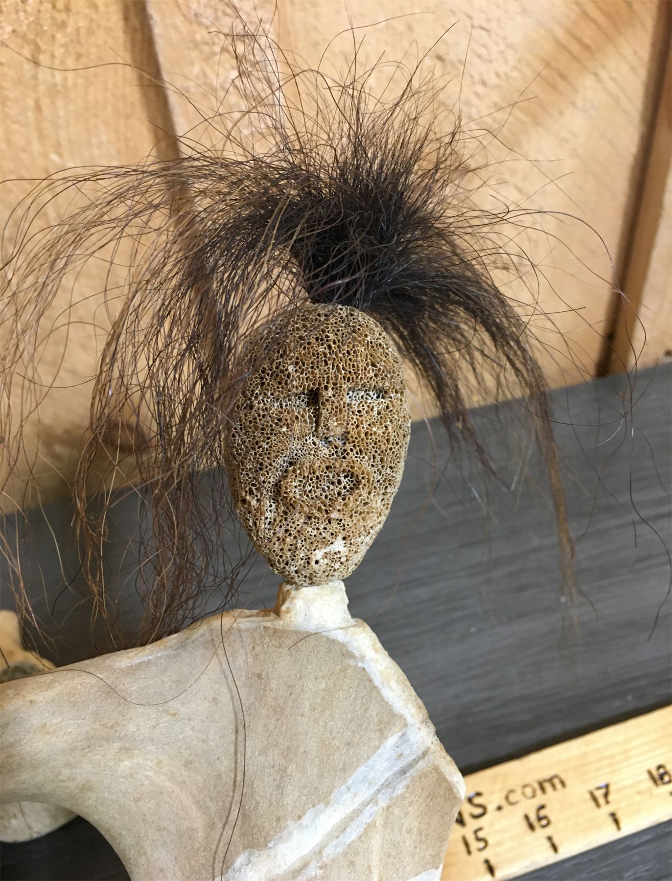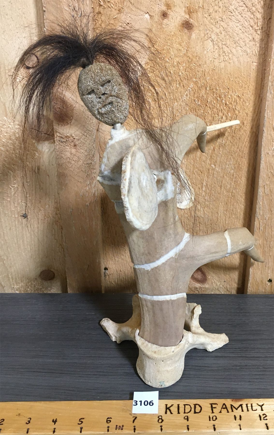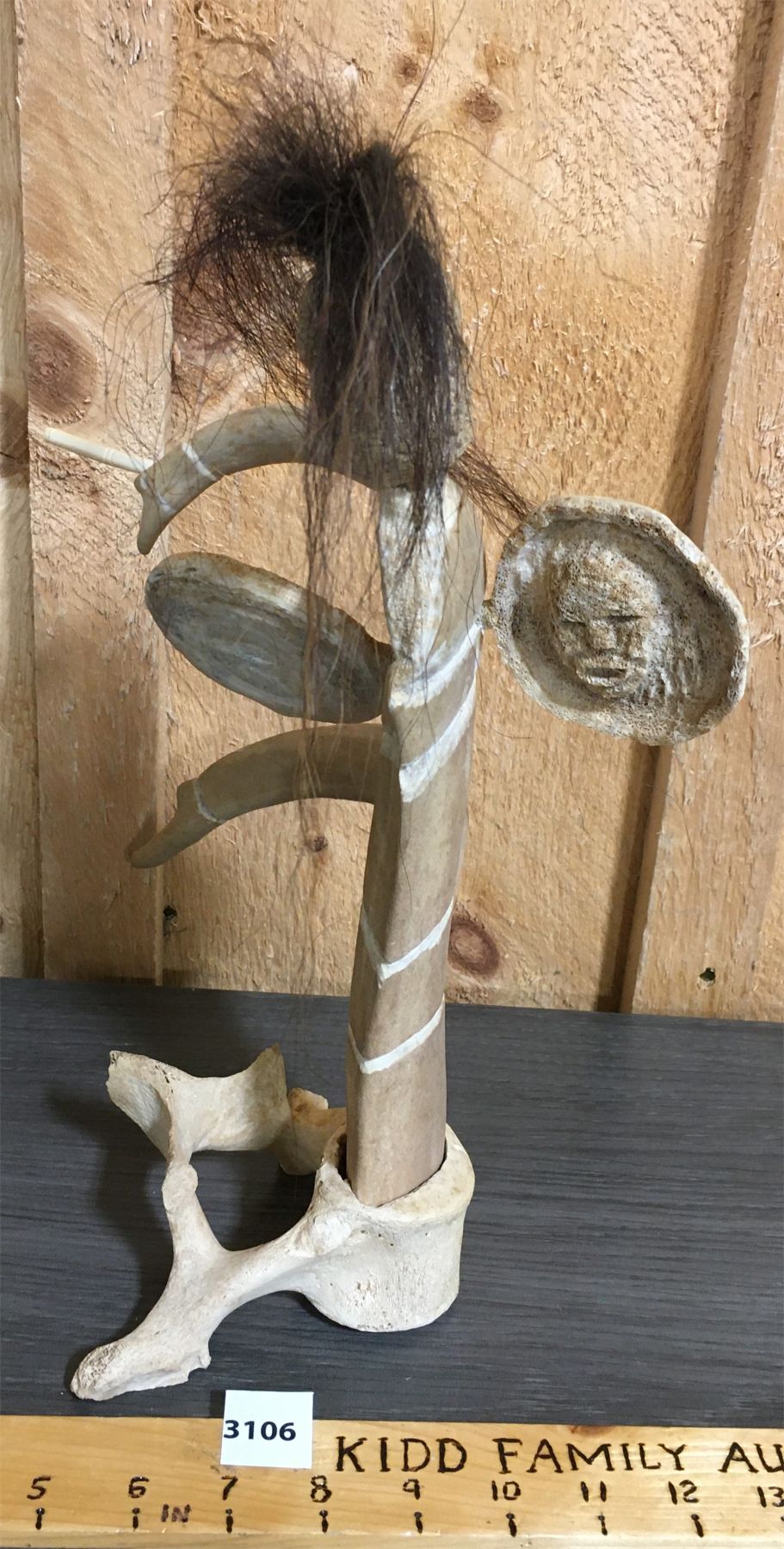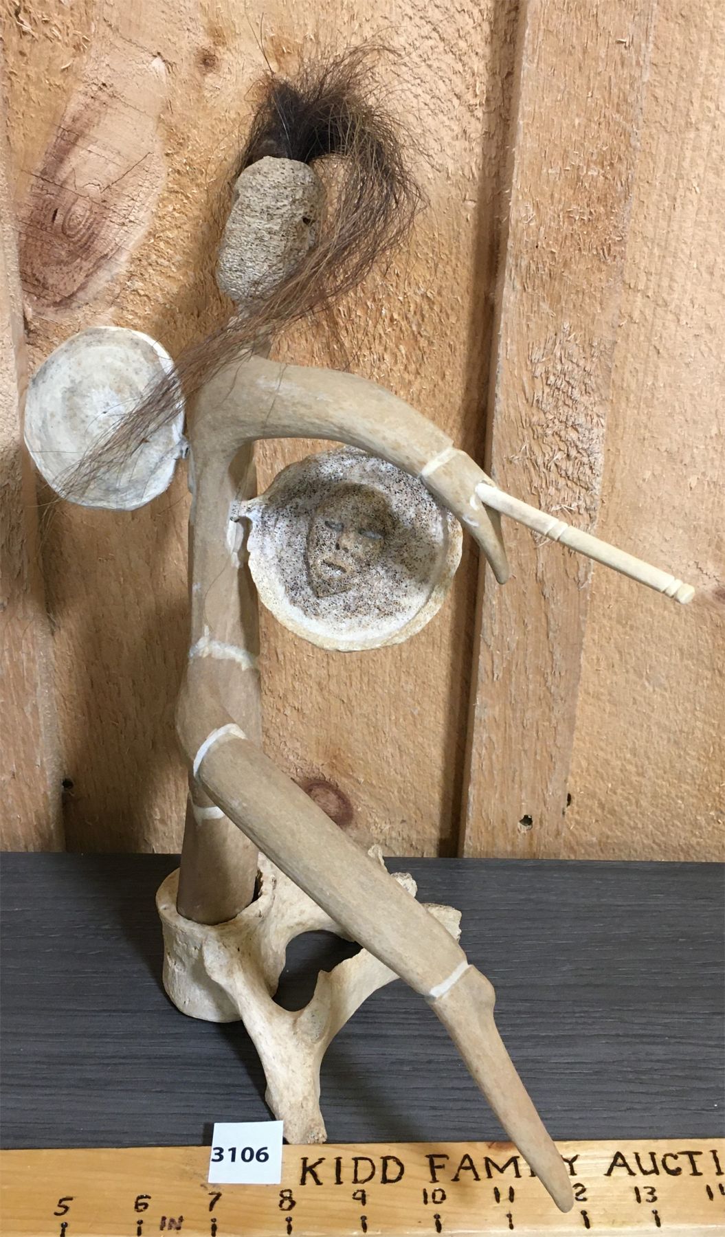NOTE: SIGNED ON BASE - MICHAEL ARVYT. CARIBOU ANTLER W/ WHALEBONE FACE AND MUSKOX HAIR