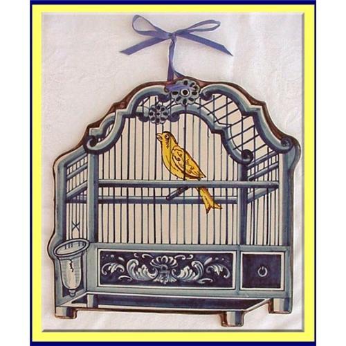 Ceramic plaque in the form of a birdcage. Cleverly painted to make 2 dimentions look like 3. A blue and white birdcage with scrolling rococco decoration and a faux drawer pull. Yeloow and brown / aubergine coloured canary singing as it swings on a perch. Outside rim of the plaque is painted the same brown/aubergine colour.