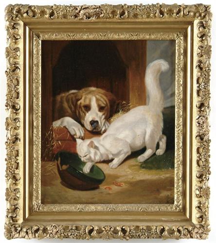 SIGNED ED (European, 19th Century) THE WATER BOWL. Oil on canvas scene shows a brown and white dog nestled inside doghouse peering out at a white cat which has paw in a green slip decorated bowl. Signed lower right with conjoined initials ED. Housed in what appears to be its original gesso decorated frame. Paris canvas stamp on reverse ""Ancienne Maison Valle, Paris"". SIZE: 18in. x 14-3/4in.. CONDITION: Three patches to reverse and corresponding inpainting, craquelure, good. 9-26143
