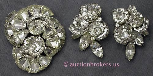 SIGNED EISENBERG COLLECTION OF CRYSTAL JEWELRY ITEMS INCLUDING MINT CONDITION RHINESTONE CLIP STYLE EARRINGS AND A MATCHING BROOCH. THESE VINTAGE PIECES HAVE BEEN WELL CARED FOR IN A SAFETY DEPOSIT BOX.