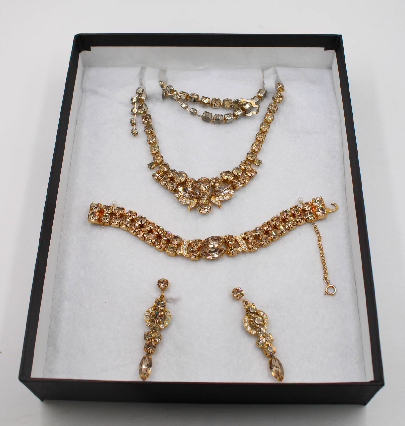 BRACELET&EARRINGS 1950'S, COMPLETE MATCHING SET, NO MISSING STONES, ALL 4 PIECES SIGNED, EARRINGS ARE CLIP, IN A GIFT BOX