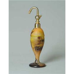 Lot 1316 SIGNED ENAMELED ATOMIZER. Clear glass atomizer is completely enameled in yellow shading to salmon with a scene of a farmhouse, lake with boat and trees. Signed on foot "Auzies". Atomizer is topped with gold colored atomizer head. SIZE: 9" t. CONDITION: Missing atomizer ball and cord, otherwise very good. 5-70038 (250-350)