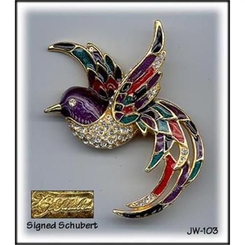 Gorgeous Art Deco style tropical BIRD brooch !!! This large piece is enameled in royal blue, red and emerald green color. It is set with round rhinestones. Dimension : 2 1/2 inches high. Excellent condition, signed SCHUBERT. It is very difficult to capture the beauty and detail with camera, which eye so easily perceives - this brooch is BREATHTAKING, you won't be disappointed!!!