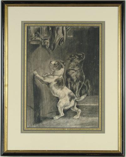 SIGNED (Early 20th Century) CHASE-CORNERED. Drawing shows two dogs that have cornered a squirrel in a lantern hung above their heads. Wonderfully housed in a black and gilt molded wood frame with gold highlighted triple matte. SIGHT SIZE: 17in. x 12in.. CONDITION: Very good. 9-95430