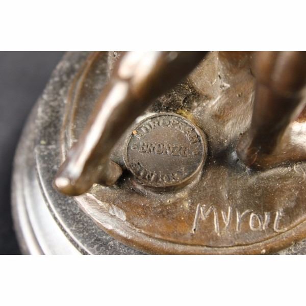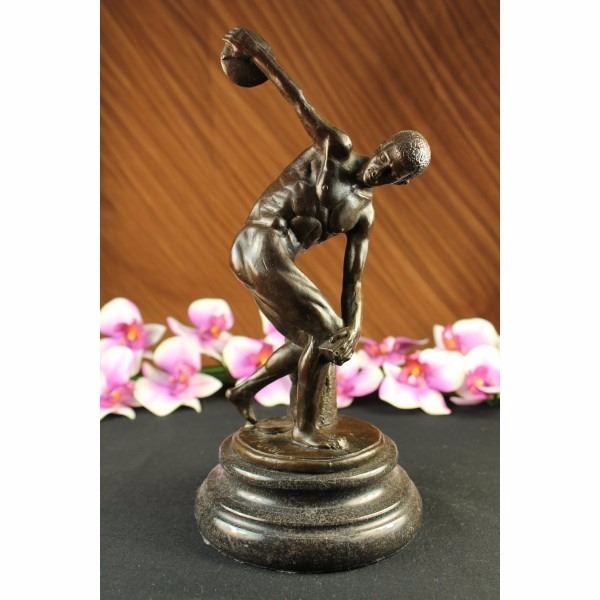 This is a bronze replica of "The Discobolus of Myron" which is a famous Greek sculpture that was completed towards the end of the Severe period, circa 460-450 BC. The original Greek bronze is lost. It is known through numerous Roman copies, both full-scale ones in marble. Here a discus thrower is depicted about to release his throw. The moment thus captured in the statue is an example of rhythms, harmony and balance one that has endured a pattern of athletic energy. The potential energy expressed in this sculpture's tightly-wound pose, expressing the moment of stasis just before the release, is an example of the advancement of Classical sculpture from Archaic. The sculpture was cast using the early method of lost-wax casting and stained with a brown patina finish for preservation. It is mounted upon a black marble base with the artist Myron's signature.Myron of Eleutherae (Greek) working circa 480-440 BC, was an Athenian sculptor from the mid-5th century BC. He was born in Eleutherae on the borders of Boeotia and Attica. According to Pliny's Natural History. He worked almost exclusively in bronze, and though he made some statues of gods and heroes, his fame rested principally upon his representations of athletes, in which he made a revolution, according to commentators in antiquity, by introducing greater boldness of pose and a more perfect rhythm, subordinating the parts to the whole. Condition: This sculpture is in perfect condition. Bronze Dimensions with Marble Base:Height 10" x Width 7" Marble Dimensions: Diameter 5" . Height without base: 8" Weight : 7 LBS Inventory :23X07182632