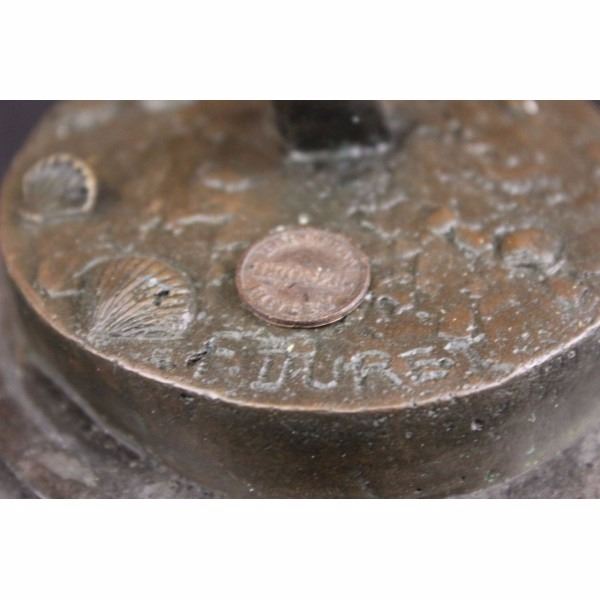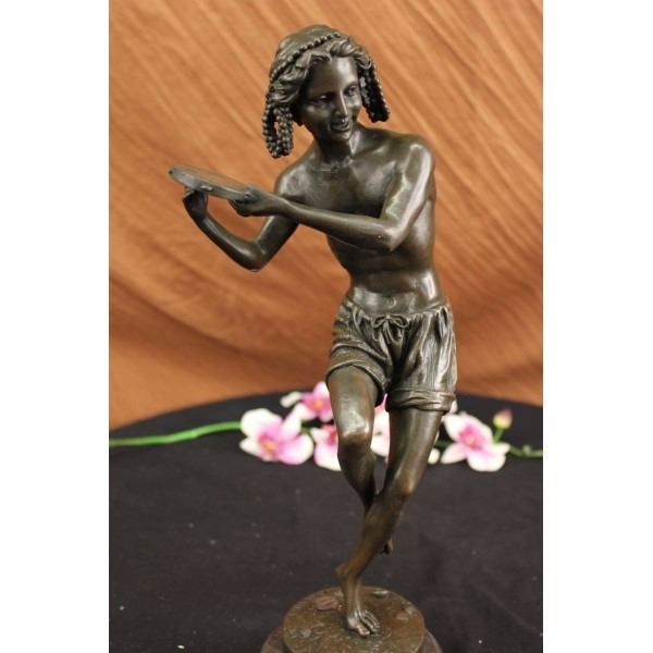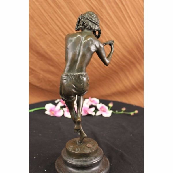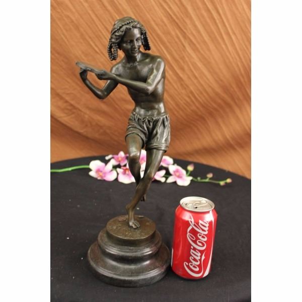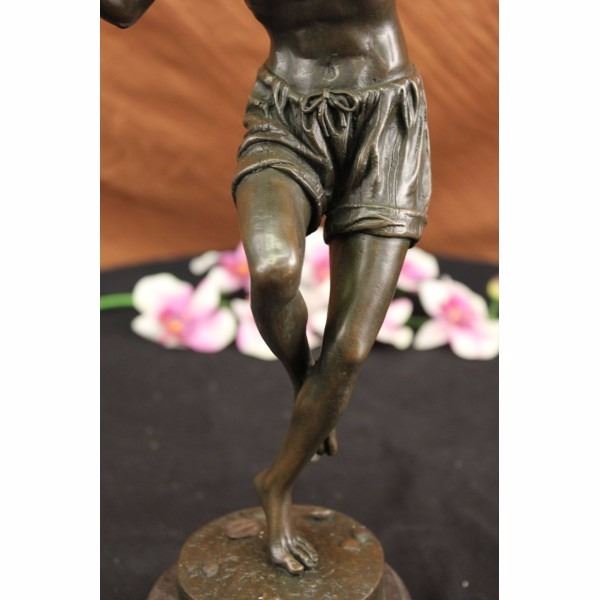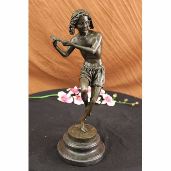 This happy entertainer dances wildly around while her shakes him tambourine and plays along to the beat of the music. He is extremely ecstatic and lifts one leg up behind the other in the midst of dance. He is a very muscular and lean man as you can see the muscle definition in his arms and legs. His shorts bunch up by his thighs giving you the feel of movement. On his head he wears a piece that has curls flowing down the side. You can see his ribs as he dance letting you know the energy he uses while he moves around. This bronze sculpture was cast using the "Lost Wax Method" and has a two tone brown patina. This sculpture is mounted on a raised beveled black marble base. This sculpture is handmade and is 100% bronze.Signed F. Duret.Francisque Joseph Duret (1804-1865) was a French sculptor, son and pupil of Franois-Joseph Duret (1732-1816). He also studied under Bosio, and won the Prix de Rome in 1823. In 1833 he exhibited his "Neapolitan Fisher Dancing the Tarantella", now in the Louvre, a spirited statue in bronze, which established his reputation. In the same class is his "Neapolitan Improvisatore" (1839, Leipzig Museum). His works executed for public buildings include: "France Protecting her Children" (1855), a group in the grand style for the Louvre; two bronze caryatids for the tomb of Napoleon in the Invalides; a colossal Christ in the church of the Madeleine; the statues of "Comedy" and "Tragedy" for the Thtre Franais; marble statues of Dunois, Philippe of France, Chateaubriand, and Richelieu at Versailles; and the group for the Fontaine Saint-Michel, representing that saint wrestling with Satan.Condition: This sculpture is in a very Good condition. Bronze Dimensions with Marble Base:Height16" x Width6"Marble Dimensions: Diameter 5 1/2"Height without base:15" Weight :12 LBSInventory : 2448B60742 This happy entertainer dances wildly around while her shakes him tambourine and plays along to the beat of the music. He is extremely ecstatic and lifts one leg up behind the other in the midst of dance. He is a very muscular and lean man as you can see the muscle definition in his arms and legs. His shorts bunch up by his thighs giving you