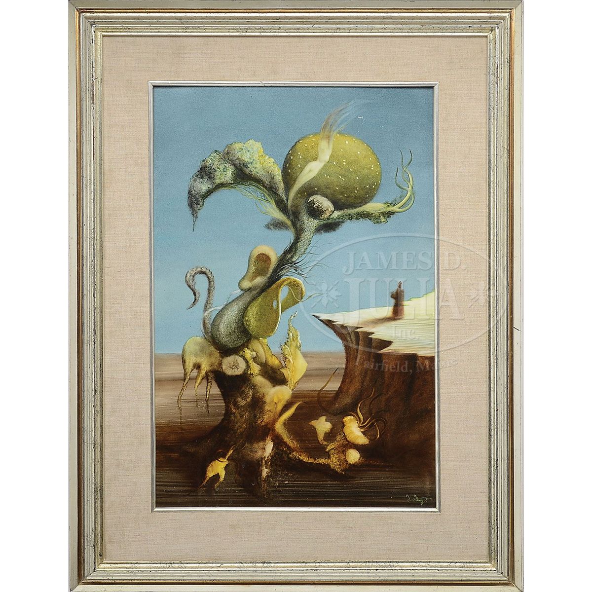Oil on Masonite Housed in a silver gilt stepped frame with linen matte having silver wood edge Signed lower right illegibly SIZE: 24" x 16". Overall: 33-1/2" x 25-1/2". CONDITION: Very good. 9-28555