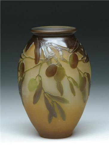 SIGNED GALLE CAMEO VASE. Galle vase has cameo decoration of green and brown olives and leaves on deep amber to peach background. Signed "Galle" on the side. SIZE: 6-1/4 in. t. CONDITION: Very good to excellent. 5-60816