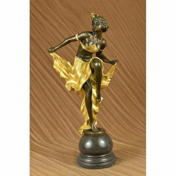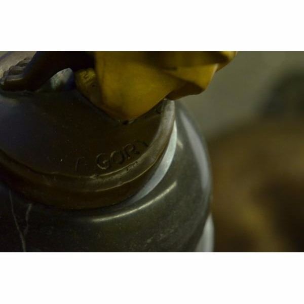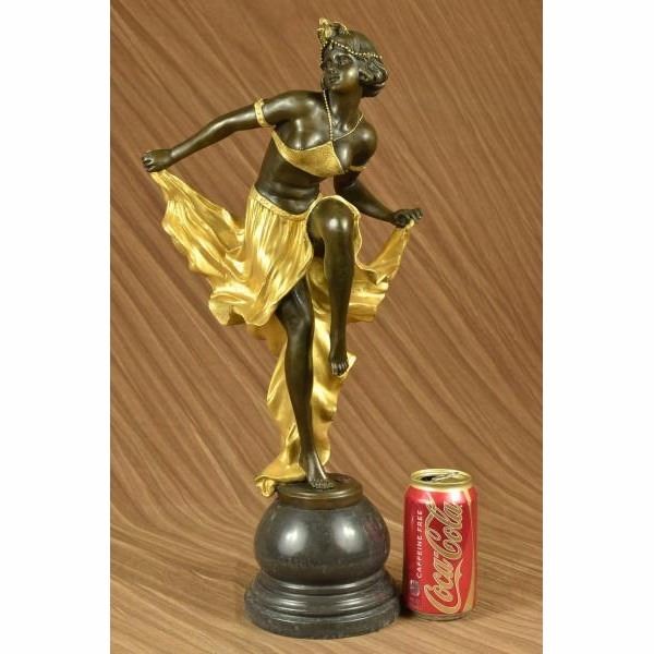 As our wild flapper dances wildly she smiles and lifts her skirt up high as she dances the night away. She bends forward and lifts her leg as her small hard nipples poke out from her top. Her top is made a material with a textured surface and is barely being held up by a beaded neck tie. She is barefoot and carefree of her exposure. Her short hair is held back by an interesting head piece in the shape of a bird with a bead dangling from the middle and beads wrapping around her head. She has arm bands with studded accents and her skirt is held in place by a belt with a floral imprint. As she lifts her leg up high she pulls her skirt out to the side creating a gorgeous caption of still flowing motion. The sculpture was casted using the “Lost Wax Method†and has a brown and gold patina . The statue is signed A. Gory. Condition: This sculpture is in perfect condition. Bronze Dimensions with Marble Base:Height 20"x Width 10" Marble Dimensions: Diameter 6". Height without base: 16" Weight : 19 LBS Inventory : 28EP570J12982