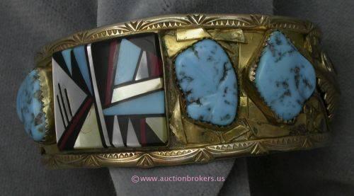 SIGNED HAND CRAFTED NATIVE AMERICAN PAWN 12 K GOLD OVER STERLING CUFF STYLE BRACELET SET WITH THREE LARGE NUGGET TURQUOISE STONES AND AN INLAY OF ONYX, MOTHER OF PEARL, CORAL, AND TURQUOISE. 1.25 INCHES WIDE. 54.4 GRAMS.