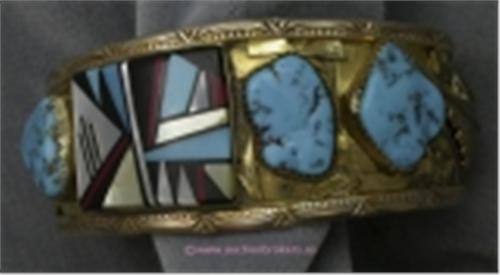SIGNED HAND CRAFTED NATIVE AMERICAN PAWN 12 K GOLD OVER STERLING CUFF STYLE BRACELET SET WITH THREE LARGE NUGGET TURQUOISE STONES AND AN INLAY OF ONYX, MOTHER OF PEARL, CORAL, AND TURQUOISE. 1.25 INCHES WIDE. 54.4 GRAMS.