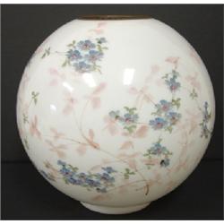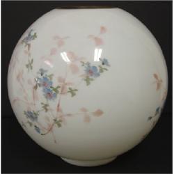 SIGNED HANDEL LAMP SHADE. White glass shade with hand painted blue and pink floral decoration. Signed at bottom rim. Slight flaking around bottom of base. 10” H