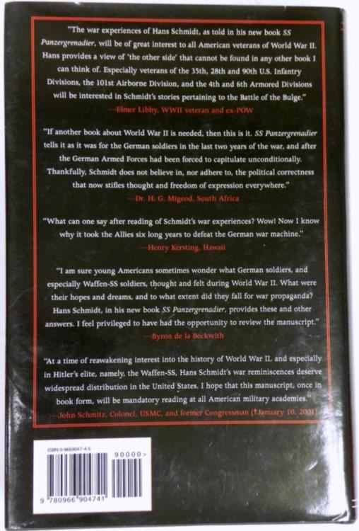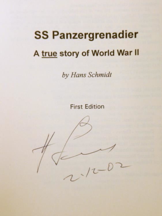 OFFERED HERE IS A SIGNED HB "SS PANZERGRENADIER-HANS SCHMIDT" BOOK. IT IS A 2001 HARD BOUND EDITION-MINT-WITH 2002 SIGNATURE OF SCHMIDT.