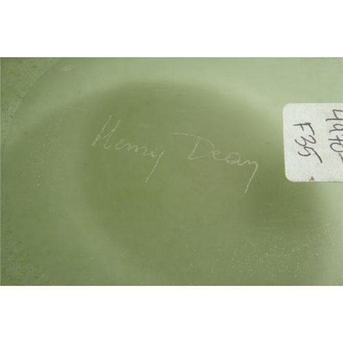 ART GLASS: Henry Dean (Belgium) signed art glass vase, pale green with orange and yellow abstract tree design, 7.25'' x 6.25'', contemporary.