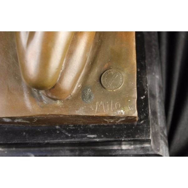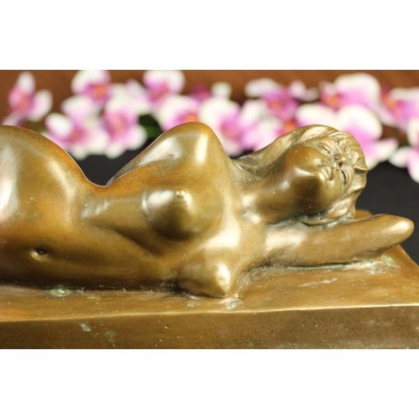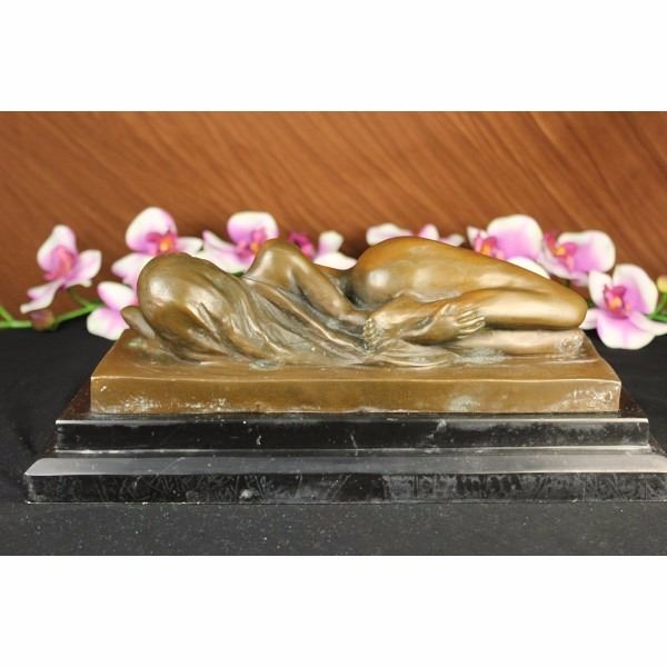 The nude beauty lays on her left side only wearing a smile of quiet bliss. There is a sense of naturalism to her pose making her come to life as though laying in the morning light of the peace of dawn. The way she lays in pure comfort in her shell emphasizes the curves of her feminine body. Her head rests on her bended left arm as her eyes serenely close. Her full breasts barely fall to gravity as her waist pinches into her curvaceous hips and thighs. This sculpture romanticizes the feminine form in its natural beauty. The bronze maiden was captured using the antiquated method of lost-wax casting and stained with a brown patina tarnish. She is mounted upon a black marble base with the artist Milo's signature Condition: This sculpture is in perfect condition. Bronze Dimensions with Marble Base:Height 6" x Width 13" Marble Dimensions: 13" x 6" Height without base: 5" Weight : 15 LBS Inventory : 45DS3514544