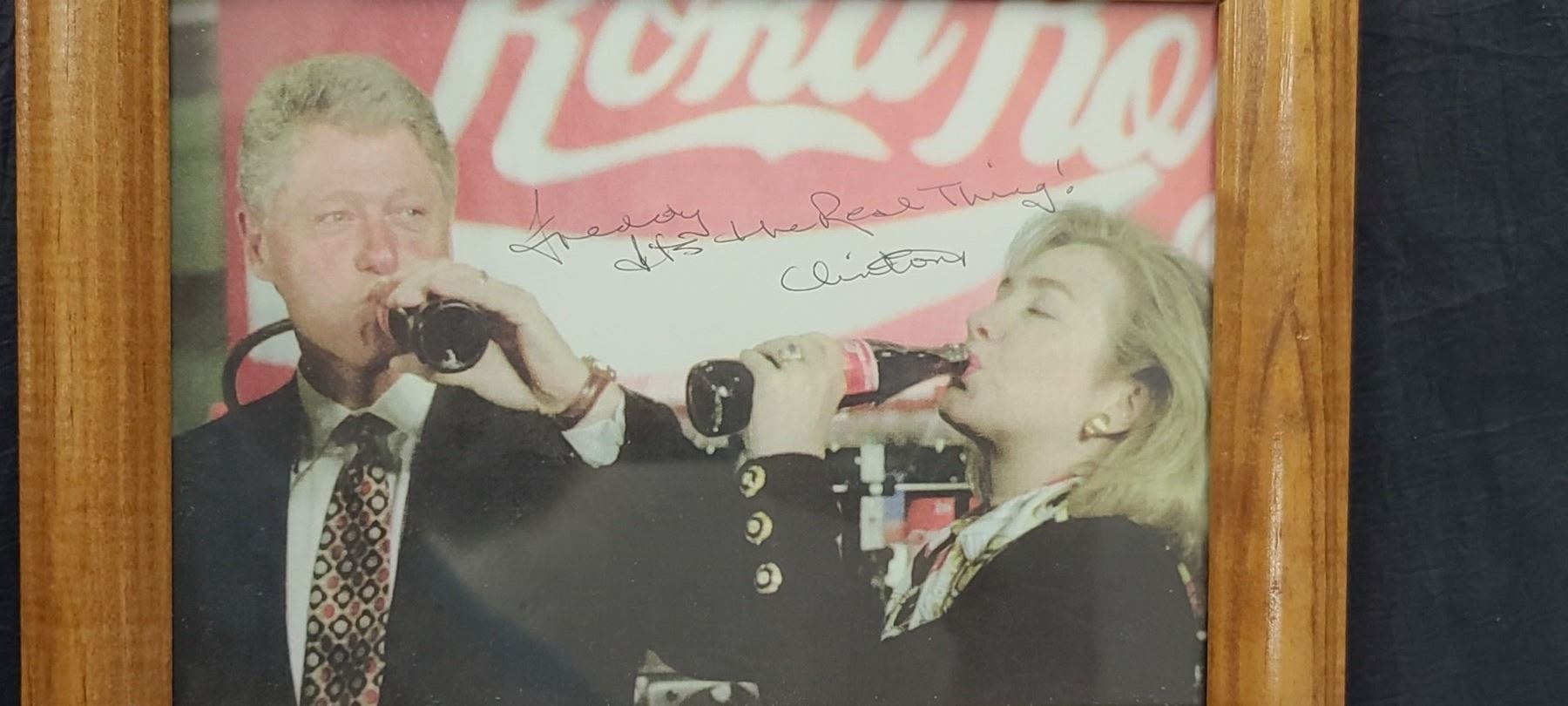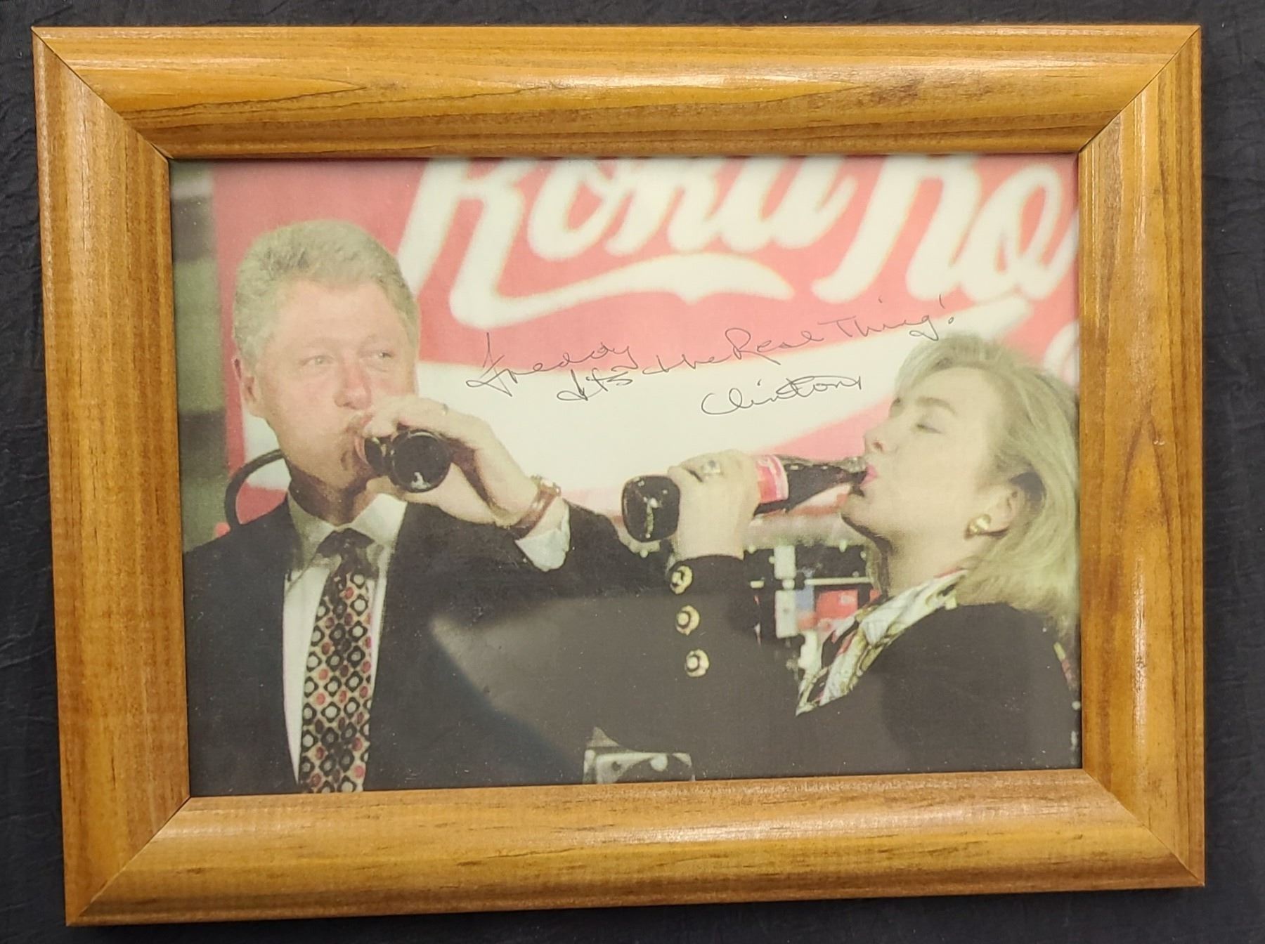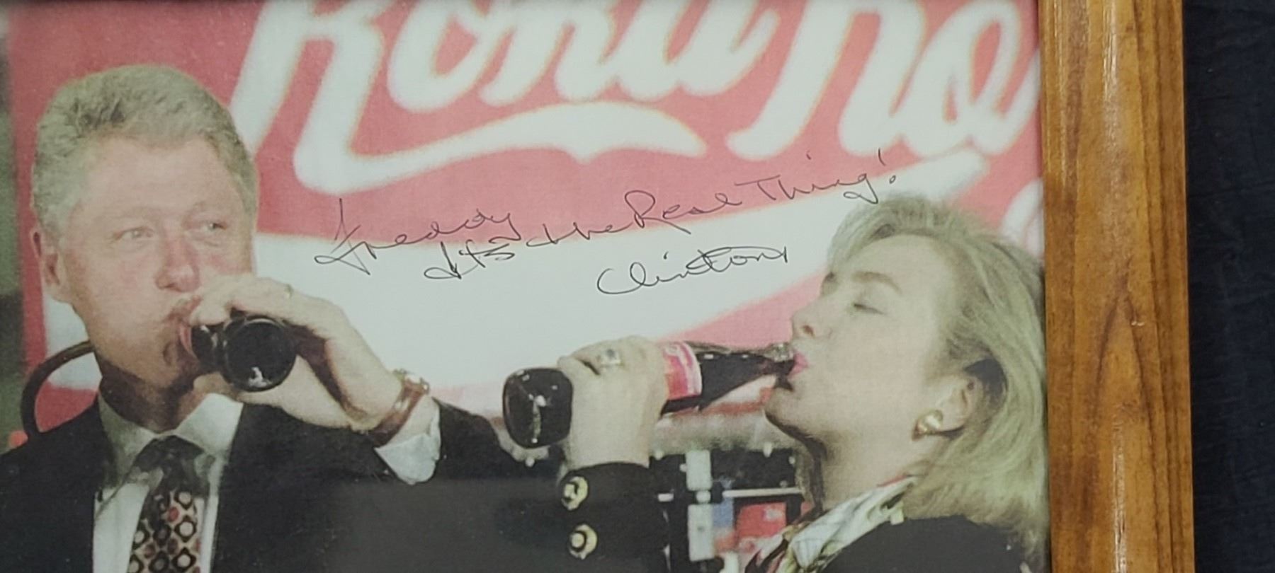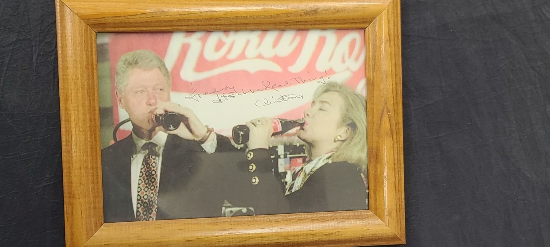 SIGNED IMAGE OF THE CLINTONS DRINKING COCA COLA, FRAMED