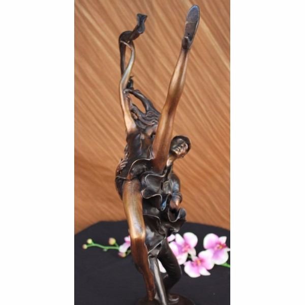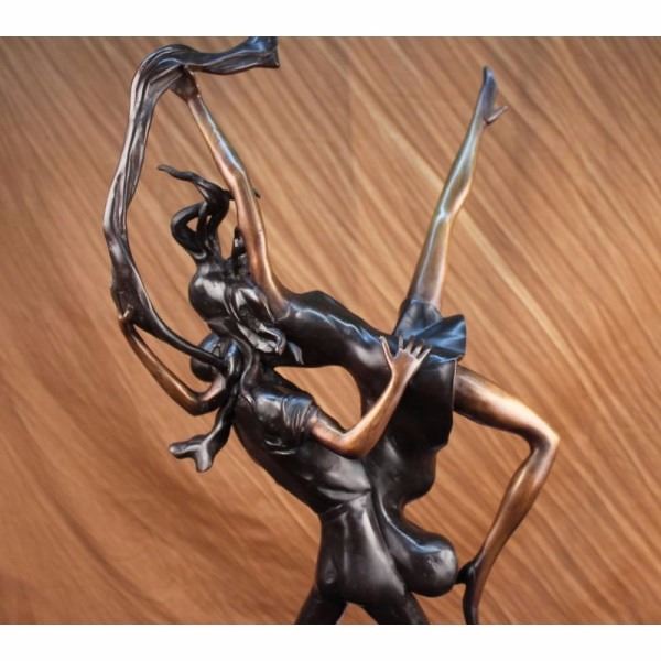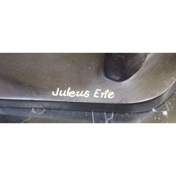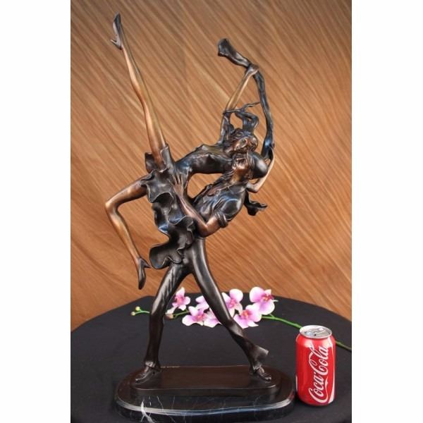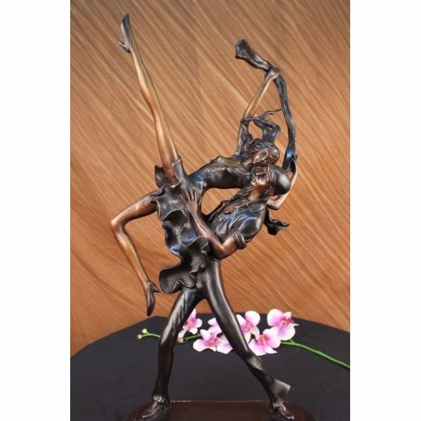 This divine sculpture of a beautiful couple swinging away to the famous "Lindy Hop" is astonishing. He quickly but very steady lifts her as she kicks her left leg up in the air. Adding flavor to the dance she holds a piece of cloth and is wearing a mini-dress that is cut very low around her cleavage. The Lindy Hop evolved in Harlem, New York City in the 1920s and '30s and originally evolved with the jazz music of that time. Lindy was a fusion of many dances that preceded it or were popular during its development but is mainly based on jazz, tap, breakaway, and Charleston. When "Air steps" or "aerials" such as the Hip to Hip, Side Flip, and Over the Back (the names describe the motion of the woman in the air) began to appear in 1936 a lot of the first creators disapprove, but it became an instant hit. Air steps are now widely associated with the characterization of Lindy hop, despite being generally reserved for competition or performance dancing, and not generally being executed on any social dance floor. This sculpture was cast using the ancient old "Lost Wax Method" stained in a two tone brown patina finish for preservation. 100% handmade and 100% bronze, mounted atop a black marble base and is signed by artist Julius Erte. Condition: This sculpture is in perfect condition. Bronze Dimensions with Marble Base:Height 26" x Width 18" Marble Dimensions: Diameter 12" Height without base: 25" Weight : 20 LBS Inventory : 18-56428M15981