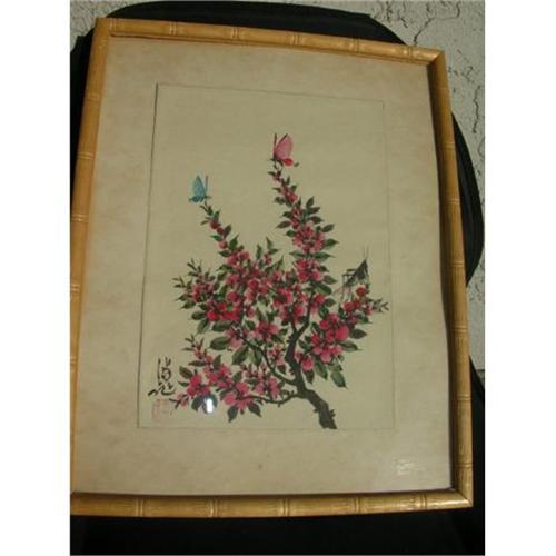 THIS PAINTING IS A WATER COLOR, SIGNED IN JAPANESE.  THE PAINTING IS ON SPECIAL PAPER (RICE?) AND IS PASTED ON THE FRAME.  A COLLECTOR MIGHT KNOW THE ARTIST SIGNATURE.  THE ACTUAL PAINTING ON THE SPECIAL PAPER IS  APPROX 10.5" (26.5CM) X 7.25" (18.5CM).  THE BAMBOO FRAME IS 15" (38CM)X 12"(30CM) AND IS IN GOOD CONDITION.