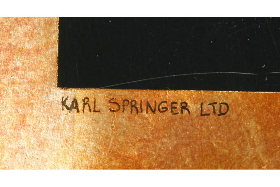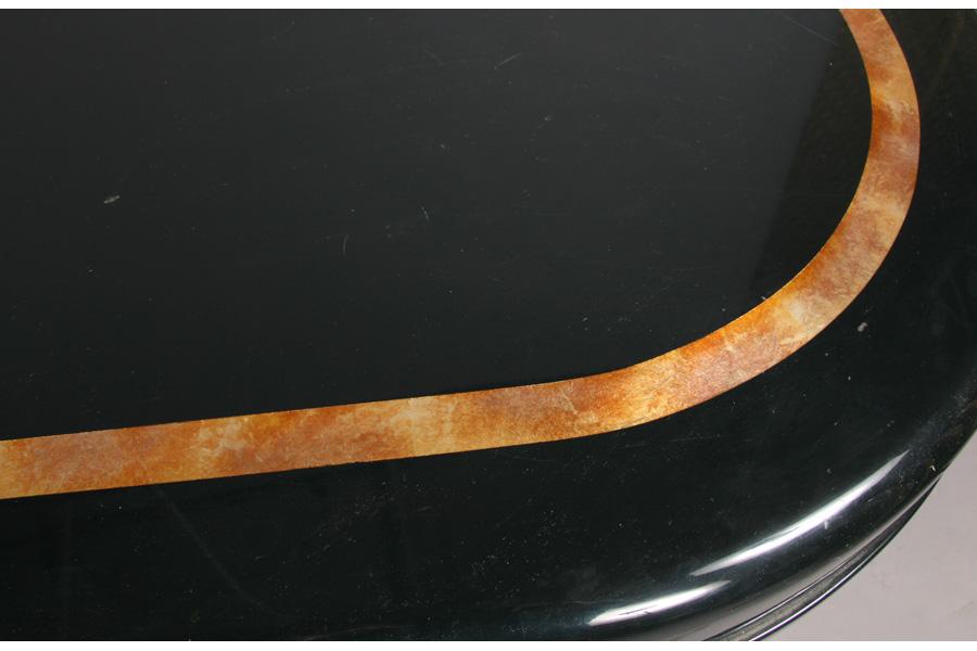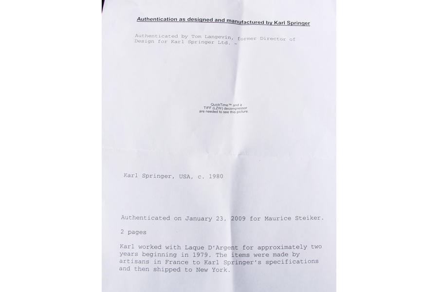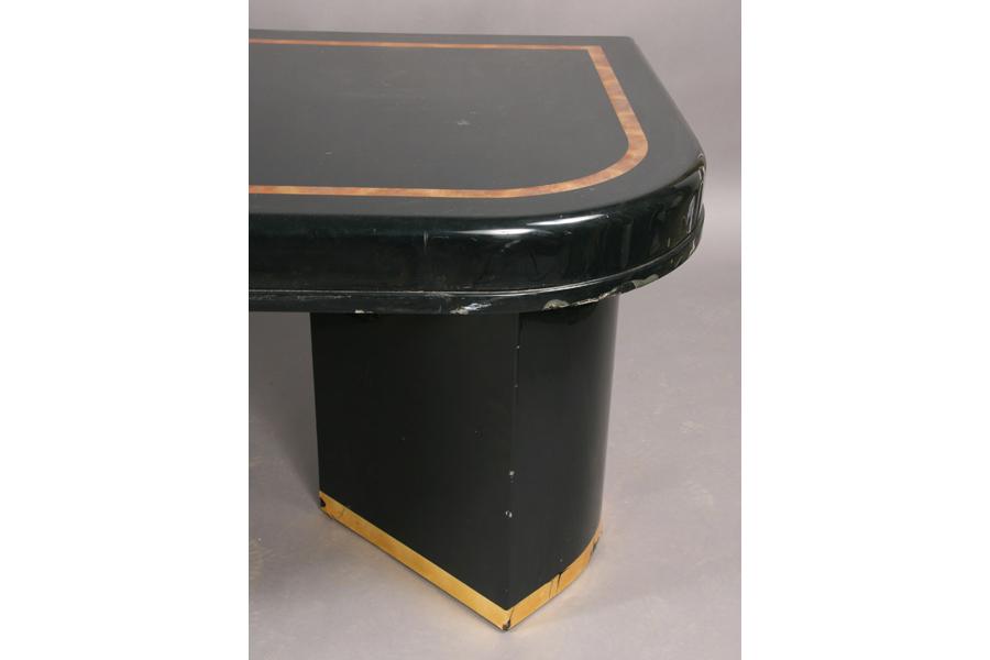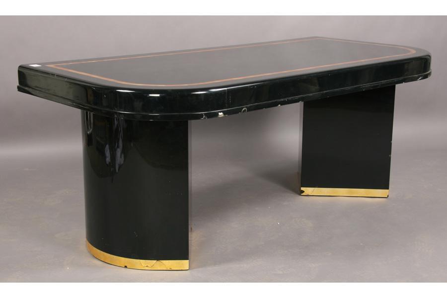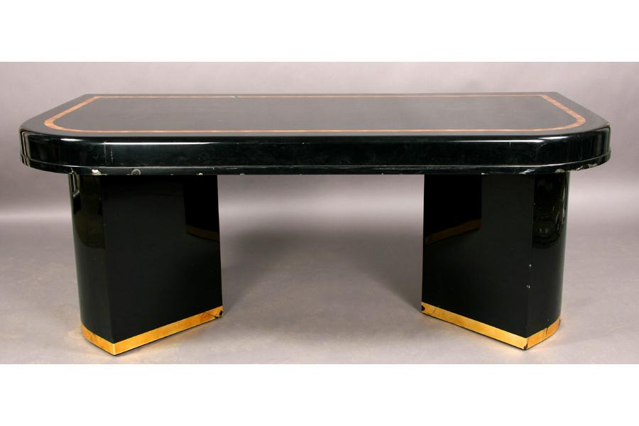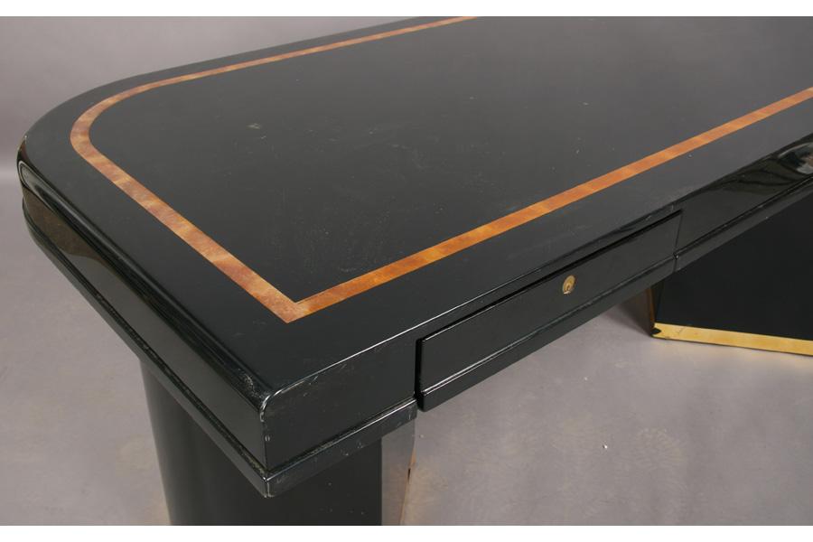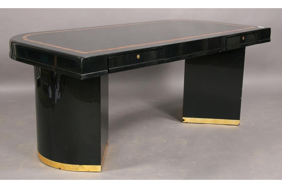 Very good signed Karl Springer black lacquered desk with gilt banding on the shaped top and two drawers circa 1970. The top supported by shaped pedestals with banded base. Ht: 30.5" Width: 74.5" Depth: 36" ***PLEASE NOTE: All property shall be paid for by the purchaser within five (5) business days of the sale. Kamelot Auctions accepts cash (In house only), personal checks, certified checks and money orders. We do not accept credit cards or Paypal under any circumstances. Please note our policy regarding payments from International buyers: The only acceptable method of payment is a bank wire/bank transfer. For invoices more than $1000, there is no additional fee for this service. For invoices less than $1000, please include an additional $25 wire fee. We will be happy to forward our bank wiring information after the completion of the auction. Thank you for your understanding and cooperation. All purchases must be removed within 15 business days after an auction. Property not removed from our facility after 15 business days will be moved to an off-site storage facility at a charge of $10.00 per day payable by the buyer. Kamelot does NOT provide shipping services or estimates. However, we recommend the following independent shipping services: Antique Transport Co. at antiquetransport@cs.com, Farren Transport at farrentransport@comcast.net or All Points Shipping at jb@allpointsshippingnj.com for quotations and shipping arrangements for furniture and other large items that would require a blanket wrap shipping company. For quotations and shipping arrangements for smaller items that would traditionally be shipped through UPS, please contact The UPS Store at store4744@theupsstore.com or The Packaging Store at hrpa112@aol.com. Clients are welcome to pick up their items from our location or make their own shipping arrangements.