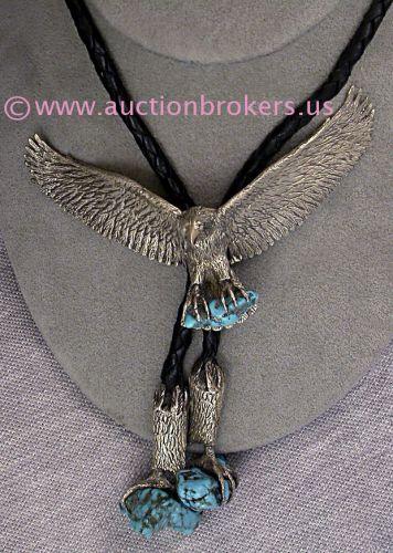 SIGNED LIMITED EDITION 57/150 MUENCH 1977 BOLO TIE THAT FEATURES A STERLING SILVER EAGLE WITH OUTSTRETCH WINGS (4 INCHES) AND TURQUOISE NUGGETS HELD IN CLAWS. FIGURAL CLAWS WITH TURQUOISE NUGGETS FINISH THE TIE AS THE TIPS. 85 GRAMS.