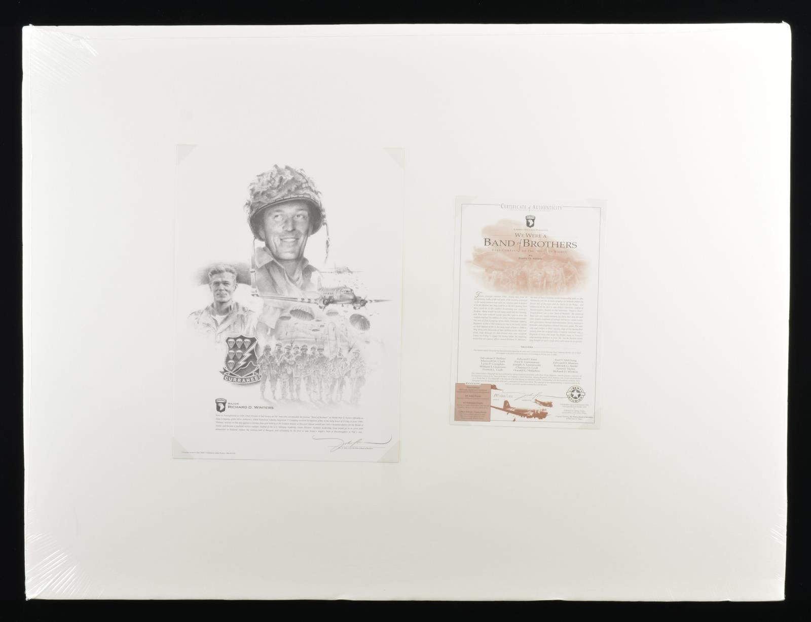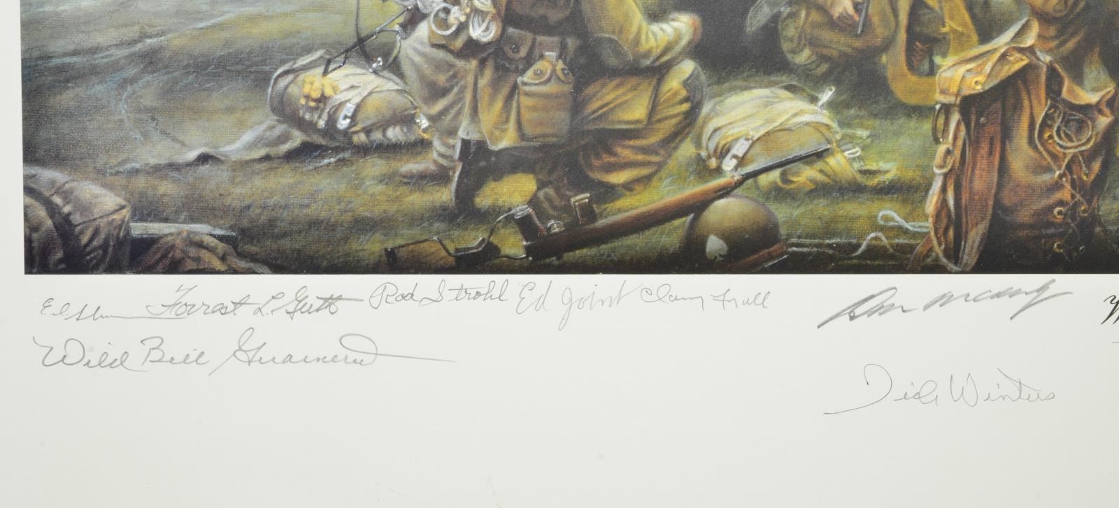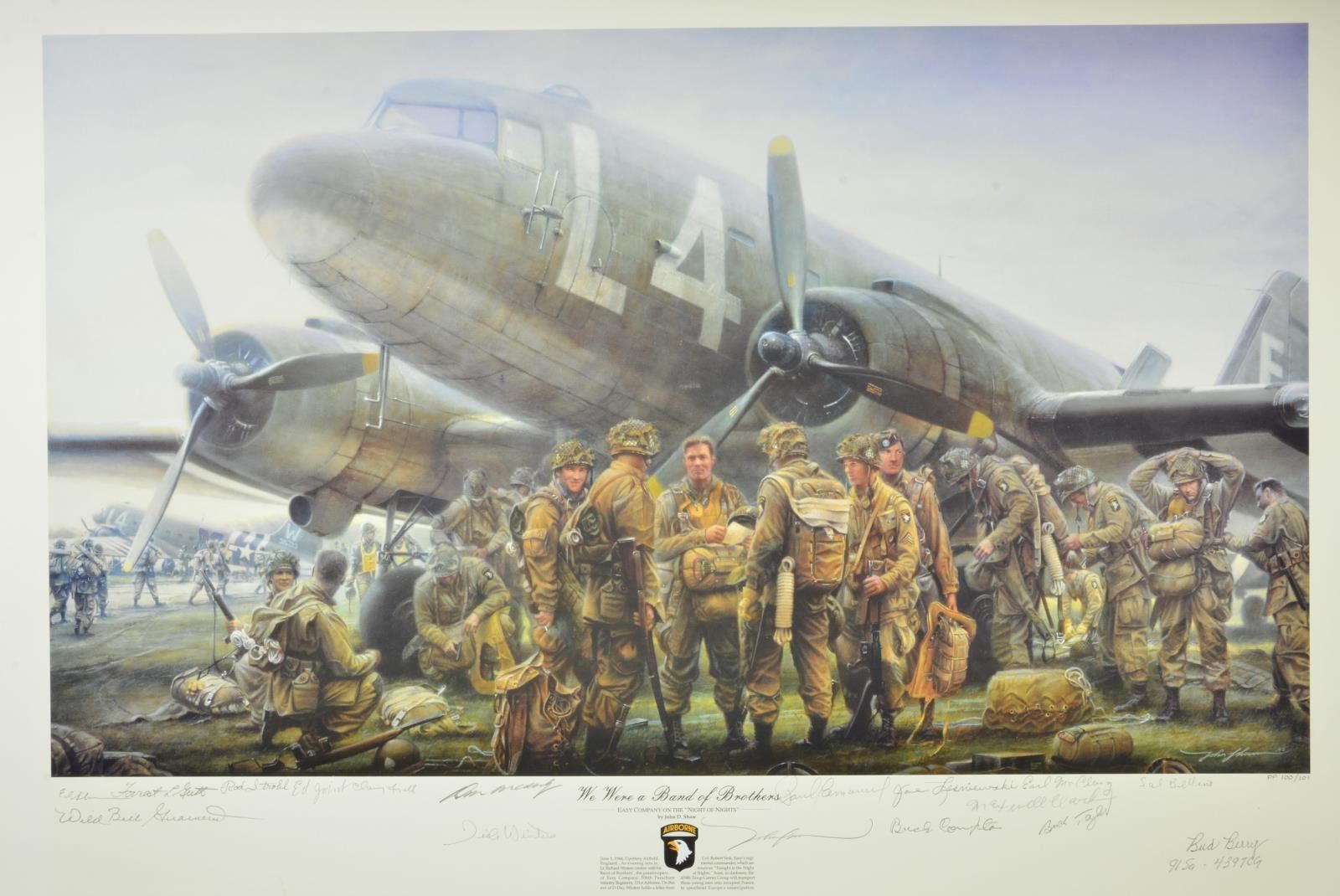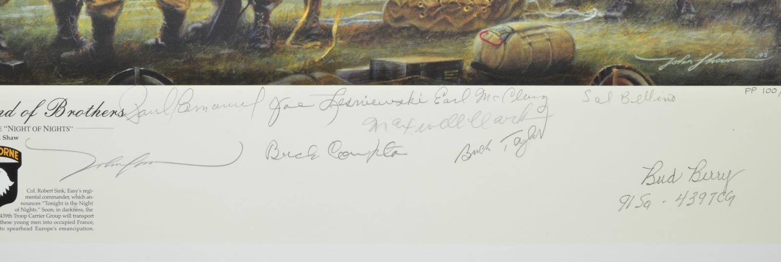 PROOFs. (#100) - WE WERE A BAND OF BROTHERS - EASY COMPANY ON THE NIGHT OF NIGHTS. Limited edition lithograph published by Liberty Studios, in association w/ Ghost Wings Magazine. Personally signed by the artist and the following Easy Company veterans, all of whom participated in the allied Airborne invasion of Normandy on D-Day, June 6, 1944. Salvatore F. Bellino, Maxwell M. Clark, Lynn P. Compton, William J. Guarnere, Forrest L. Guth, Edward J. Joint, Paul E. Lamoureux, Joseph A. Leniewski, Clarence O. Lyall, Donald G. Malarkey, Earl V. McClung, Edward D. Shames, Roderick G. Strohl, Amos J. Taylor, Richard D. Winters & C-47 Pilot Gerald C. Berry. Print measures 24"x34.5" & mounted on 30"x40" foam board. CONDITION: No visible flaws, wrinkles, tears or fading. Plastic covering foam mounting. (02-16953-14/JZ). $200-400