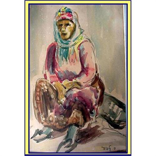Signed Middle East water color painting by listed Israeli artist, Danny Gilboa. Dated 1955.<BR>Measures 8 1/4 X 13 inches.<BR>Painting depicts a seated woman in slipper-type shoes, long skirt, aprons and scarves wound around her head. She is from the Middle East / Oriental country - maybe an Arab lady or a Bedouin or even a Jewess from one of the North African / Middle Eastern countries. Subtle use of paint - note paterns on her skirt and play of colours on her scarf and chest; shadows and free use of pencil underneath the paint.<BR>Signed lower right in Hebrew D. Gilboa 1955.<BR>Condition is good. There is a narrow waterstain on the edge of the painting that does not interfere with the figure .<BR>New frame.