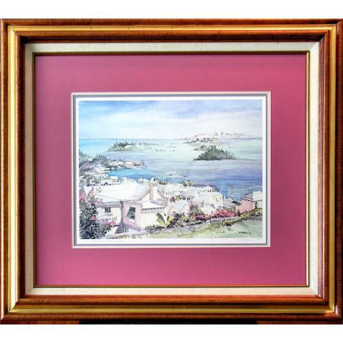 A SIGNED LIMITED EDITION PRINT OF ST. GEORGES, BERMUDA<p>A lovely signed limited edition high quality print of a watercolor islandscape painting of St. George's, Bermuda, with its charming and distinctive architecture. The watercolor medium is perfectly suited to this serene and beautiful landscape painting of some of the islands of Bermuda. The listed artist, Carole Holding, has commissioned a limited edition run of her original painting, and her signature along with a title appears at the lower edge. The viewer stands atop a high hill overlooking the quaint pastel houses leading down to and along the coastline of this town. The Atlantic Ocean with its changing hues of blue dominates the central section of this painting. Several islands, some of them tree-covered, can be seen along with various boats, with another island city in the distance. <p>The artist has titled this work in pencil, 'St. Georges, Bermuda' at lower left, and signed it, C. Holding '87', at lower right, both along the margin of the piece. The artist's signature also appears in the body of the work at the lower right. Dimensions are 25.8 inches high by 29.6 inches wide overall. It is bordered by an elegant solid wood frame of rounded sections of patinated wood with a concave gilt wood channel between them. There is an inner canvas mat with a very thin interior gilt wood molding piece. The painting is triple matted in complementary ...