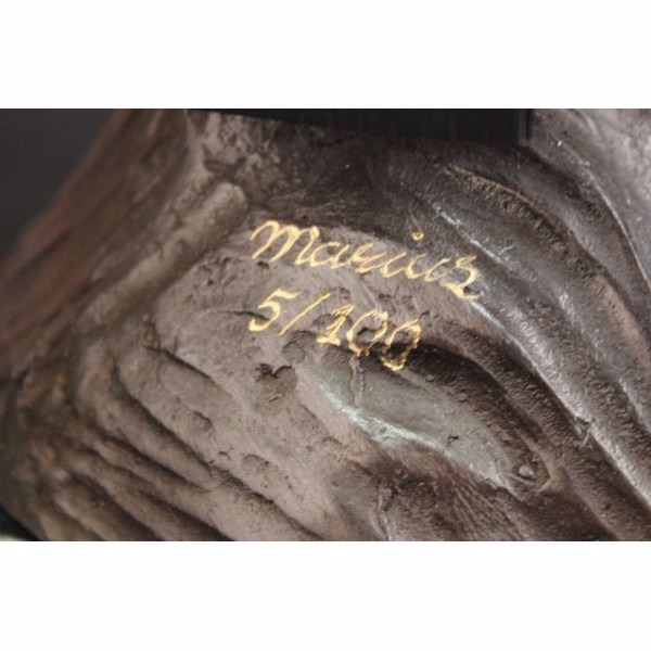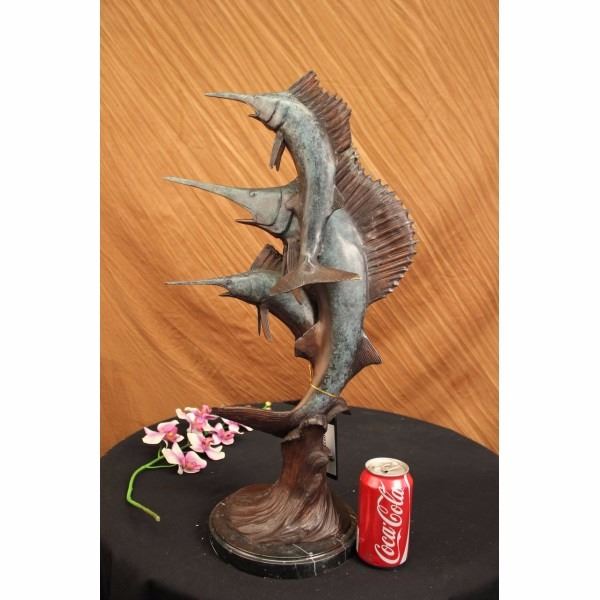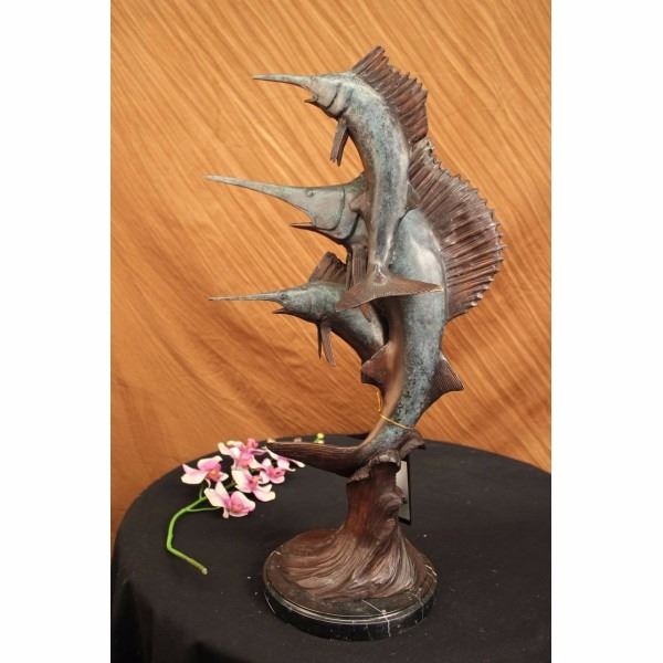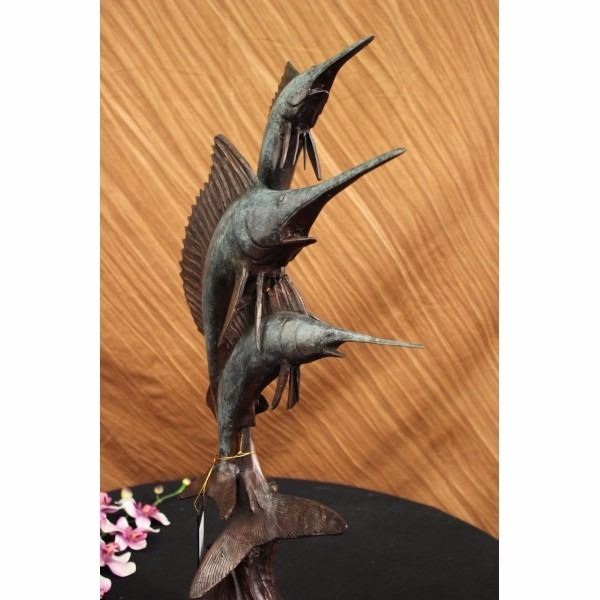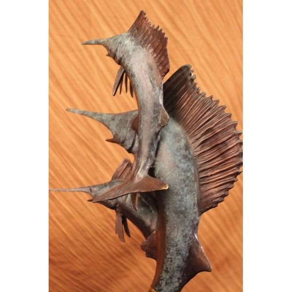 This is powerful, limited edition of 100, sculpture of three Marlin fish. They are known to be one of the fastest species of swimmers reaching 110 kilometers per hour (68mph). It is thought to be named after the Marlinspike that sailors use for knots as it also has a large spike. Three of them journey together, escalating down in size. In this sculpture they thrust themselves out of the water, caught suspended in the air, their tail almost completely free of the water in which they dwell. The smallest one stays above the others as if to prove his strength and endurance. Their body is an elongated muscle that is detailed in turquoise, the stomach a light bronze patina. The nose is pointy and sharp and their eyes deep and mystic. They jump for freedom and show their strength in this daily act. The base is a circle of black marble. This piece is cast using the Lost Wax Method and is 100% Bronze with a two tone brown with green patina. Signed by the artist Marius. Condition : This sculpture is in very Good condition. Bronze Dimensions with Marble Base:Height 24" x Width 14" Marble Dimensions:Diameter 9" Height without base: 23" Weight :17 LBS Inventory :238394092M32