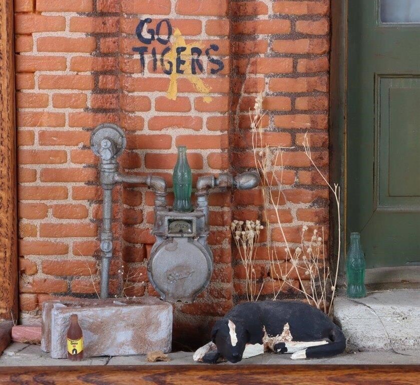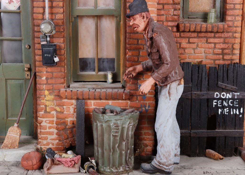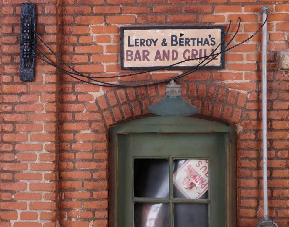 Michael Garman's (1938- Current, American) Leroy & amp; Berthas Bar and Grill Cityscape 1975.This unique sculpture, titled & quot;Leroy & amp; Bertha's Bar And Grill, & quot; is a limited edition piece by renowned artist Michael Garman. Crafted in 1975, it depicts a cityscape scene with intricate details and mixed media materials such as wood and resin. The sculpture comes with a light that highlights its stunning details. Michael’s sculptures, cityscapes, and street scenes are collected and displayed by businesses and individuals throughout the world. Included among these are former Presidents Bush and Reagan, Betty Ford, Rosalyn Carter, James Caan, Willie Nelson, Burt Reynolds, John Elway, and Colin Powell. His figures are frequently given as a piece of “Americana” to foreign dignitaries and heads of state.