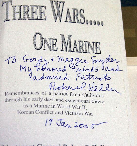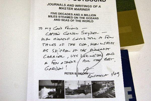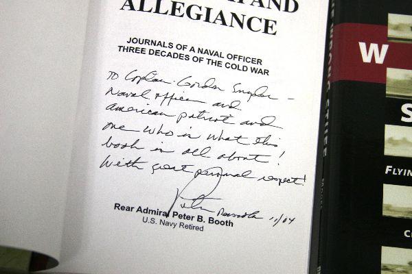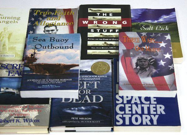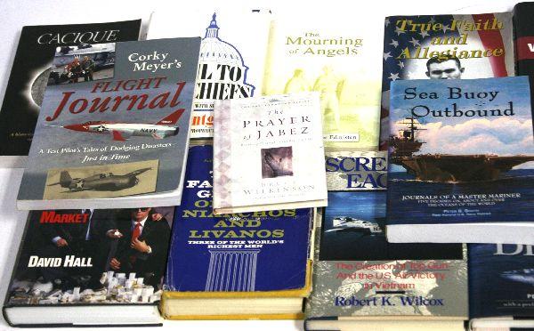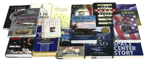 A collection of 15 signed mostly military books named to Gordon A. Snyder, former skipper of the Lexington Cv-16, and his wife Maggie. Books include authors Doris Lilly, Ruth Montgomery, Commander John Moore, Rear Admiral Peter Booth, Patricia S. Taylor Edmisten, Lee R. Scherer, Hunter Scott (USS Indianapolis), Tom Siler, David Hall, Robert Wilcox, Bernard Bennett, Bruce Wilkinson, Lieutenant General Robert Prescott Keller, and Corky Meyer. Many books signed with personal messages. Very good condition.