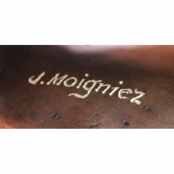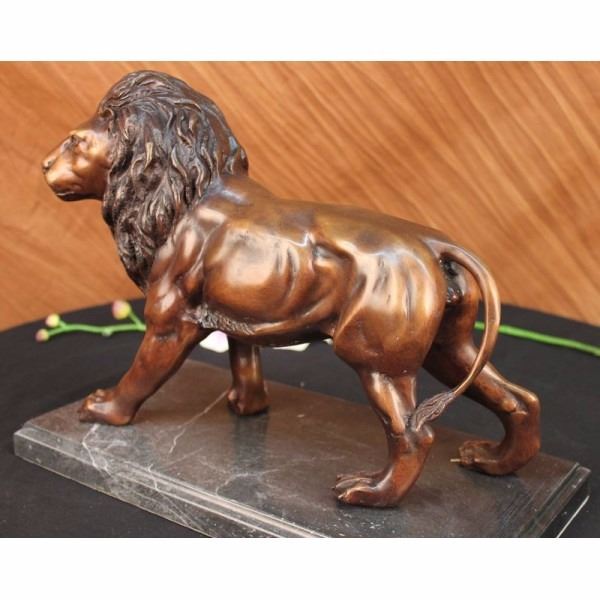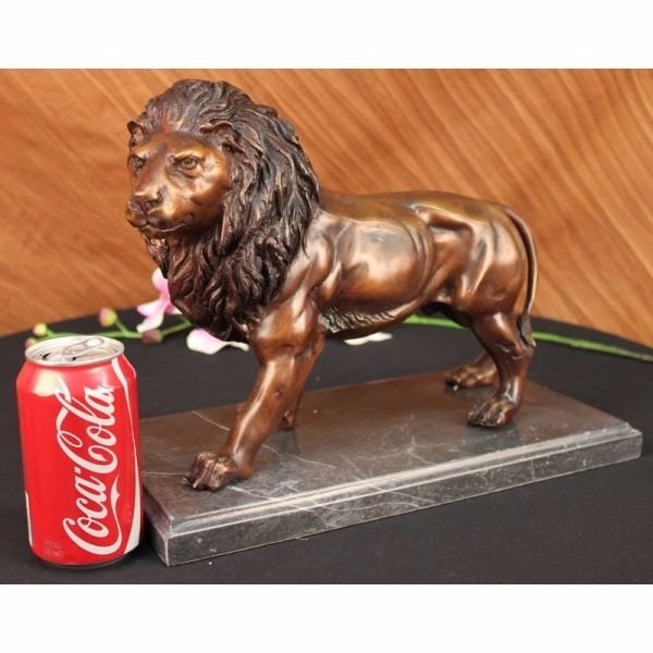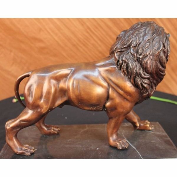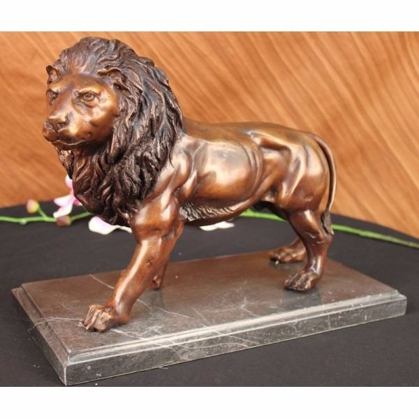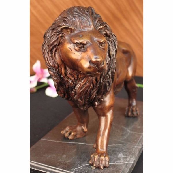 With piercing eyes and a serious look this lion is intimidating just by glance. His mane is full and covers his neck and travels down to his underside trailing off into the sides of his stomach. His paws are gigantic and he sports massive claws that seem to protrude every time he takes a step. His body is thick and muscular; he has an unmovable stance and a striking look. This bronze sculpture was cast using the Lost Wax Method and is mounted on a black marble base. This sculpture has a two tone brown patina and is signed J.Moigniez.Jules Moigniez was born in Senlis sur L'Oise, France in 1835 and died in Saint-Martin-du-Teire, France on May 29, 1894. The son of a metal gilder, Moigniez was a student of Paul Comolera. He debuted at the Exposition Universelle in 1855 with Pointer and Pheasant and Falcon and Weasel each in plaster. He contributed regularly to the Paris Salon from 1859 to 1892 during which he exhibited over thirty sculptures including Pointer and Pheasant and Falcon and Weasel in bronze. He was awarded an honorable mention at the Salon and received a medal in London at the Great Exposition in 1862. He lived most of his life in Paris. During his career he was widely popular in France, England and America. His bronzes were most decorative, particularly those of game birds. He also sculpted dogs, farm animals and equestrian groups. Moigniez's dogs reflected the "naturalism" style of Pierre Jules Mene. His bird sculptures were reminiscent of paintings by deHondecoeter, Casteels and Snyders. His sculptures of birds reflect dynamic movement, as if captured through a high-speed photographic portrait. Moigniez bronzes were edited, (cast), by the foundry his father opened in 1857. A wide variety of patinations, including silver plate, golden bronze and gilding were unique to these lifetime casts. Condition : This sculpture is in perfect condition. Bronze Dimensions with Marble Base:Height 12" x Width 16" Marble Dimensions: 14" X 7" Height without base: 11" Weight :19 LBS Inventory : 25-57854M5152