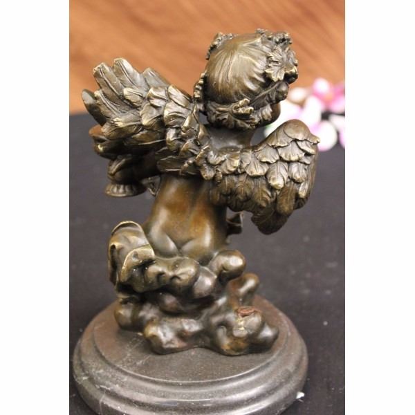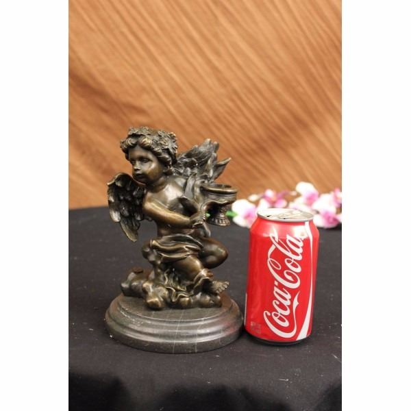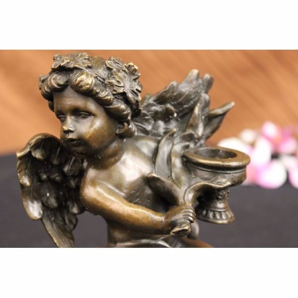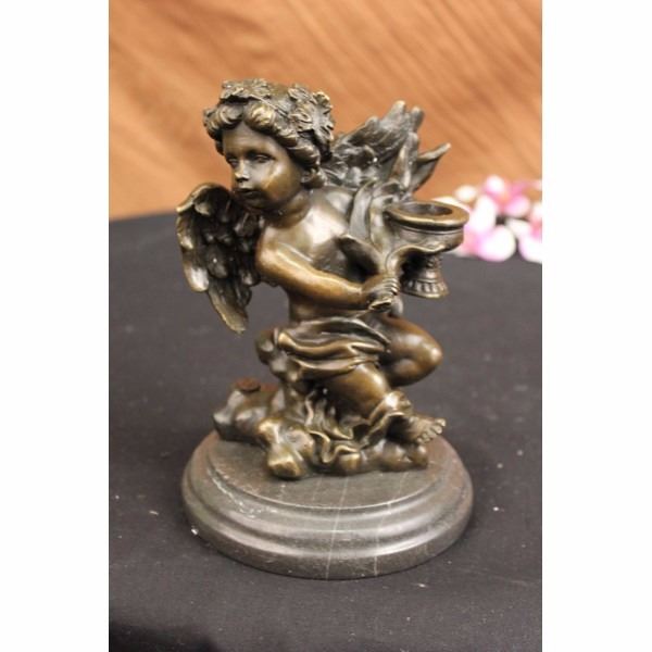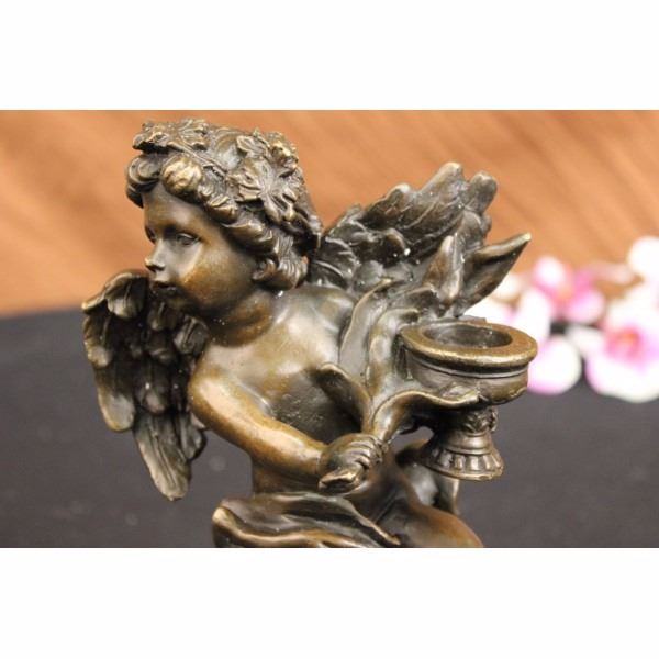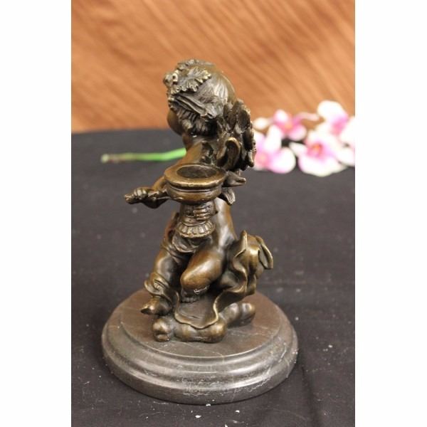 This adorable candle holder is of a young Cherub holding a spiraling plant. He rests on the edge of a rock and cradles the large stem. He wears a wreath of fruits and leaves around the crown of his head.This brown patina sculpture is one of a pair. 100% bronze and handmade, this fully detailed sculpture was cast using the "Lost Wax Method." It is mounted on a marble base and signed by the artist A. Moreau. Condition: This sculpture is in perfect condition. Bronze Dimensions with Marble Base:Height 8 1/2" x Width 5" Marble Dimensions:Diameter 5" Height without base: 7 1/2" Weight : 8 LBS Inventory : 43Y0592634