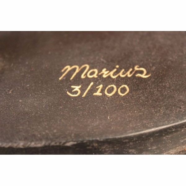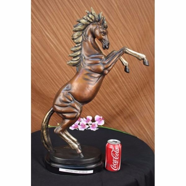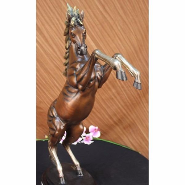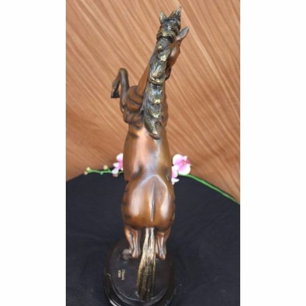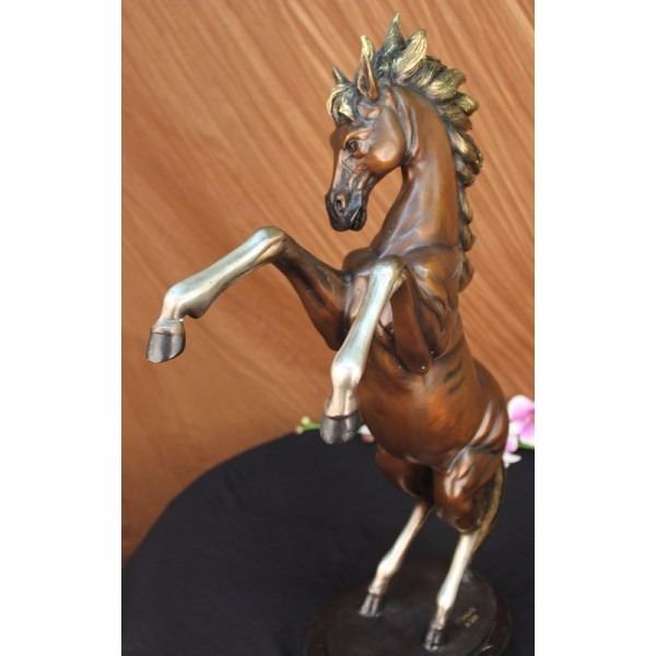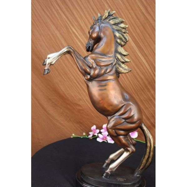 With a piercing look in her eyes she rears up high as the blood begins to flow and the veins begin to pop from her face by her nose. Her body is magnificently muscular and toned. As she brings her legs up high her muscles protrude from her shoulders and hind legs letting you the extreme strength that she empowers in herself. She is a gorgeous mare and depicts respect, beauty and strength. This bronze sculpture was cast using the “Lost Wax Method†and has special hand painted patina consisting of two tone browns with blacks, grays, and golds. This is a Limited Edition Sculpture and is signed by the artist Marius. Condition: This sculpture is in a very good condition. Bronze Dimensions with Marble Base:Height 26" x Width 18" Marble Dimensions: Diameter 10" . Height without base: 25" Weight : 26 LBS Inventory 92-58568MTS10829