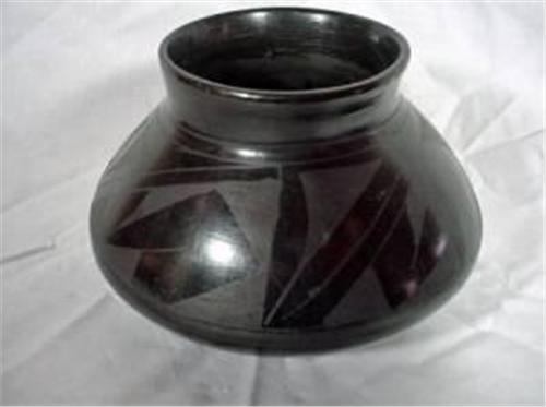 SIGNED NATIVE AMERICAN BLACK CERAMIC POT WITH ETCHED INDIAN SYMBOLS DECORATING THE BODY. PIECE IS S